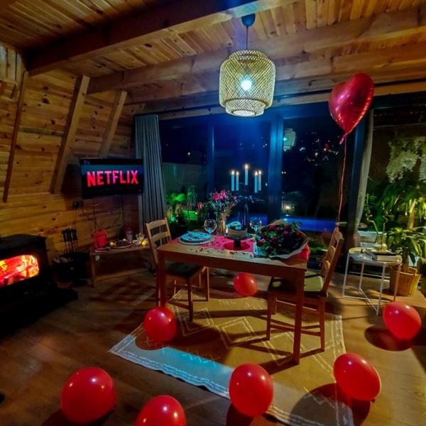 4x7 m termostatlı sıcak havuz, jakuzi, kazanlı ateş çukuru, bahçe oturma grubu, çardak içinde taş barbekü, havuz başı kapaklı barbekü, camlı şömine soba, doğalgaz sobası ve 2 adet klima sunulmaktadır. Ücretsiz otopark (kameralı), Wi-Fi, Netflix, bornoz, havlu, banyo ürünleri, tek kullanımlık terlik, saç kurutma makinesi ve ütü de mevcuttur.