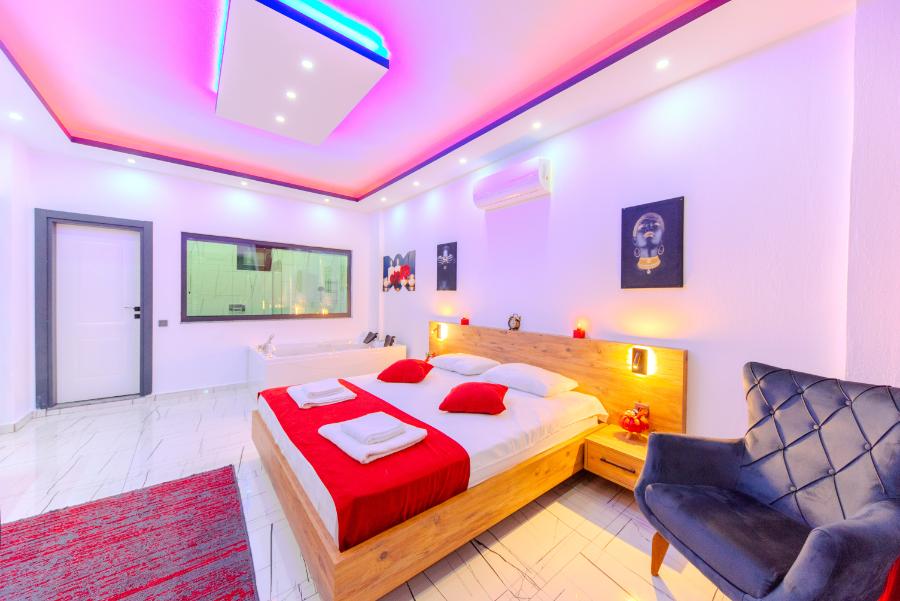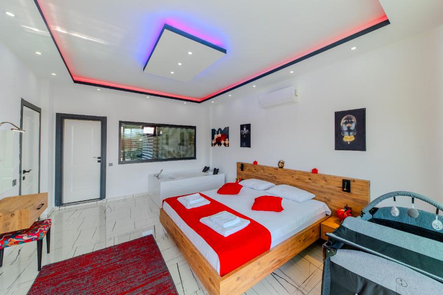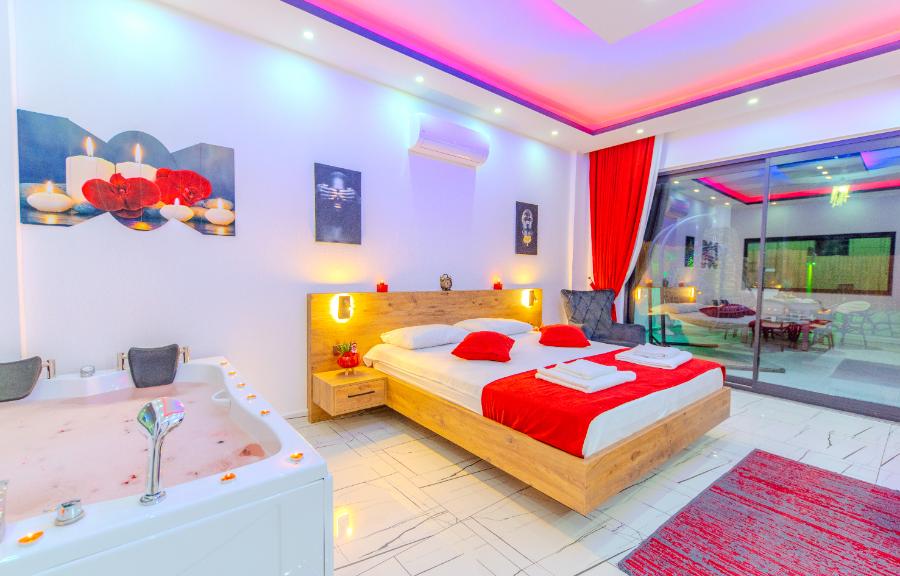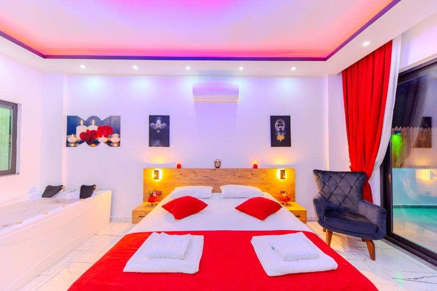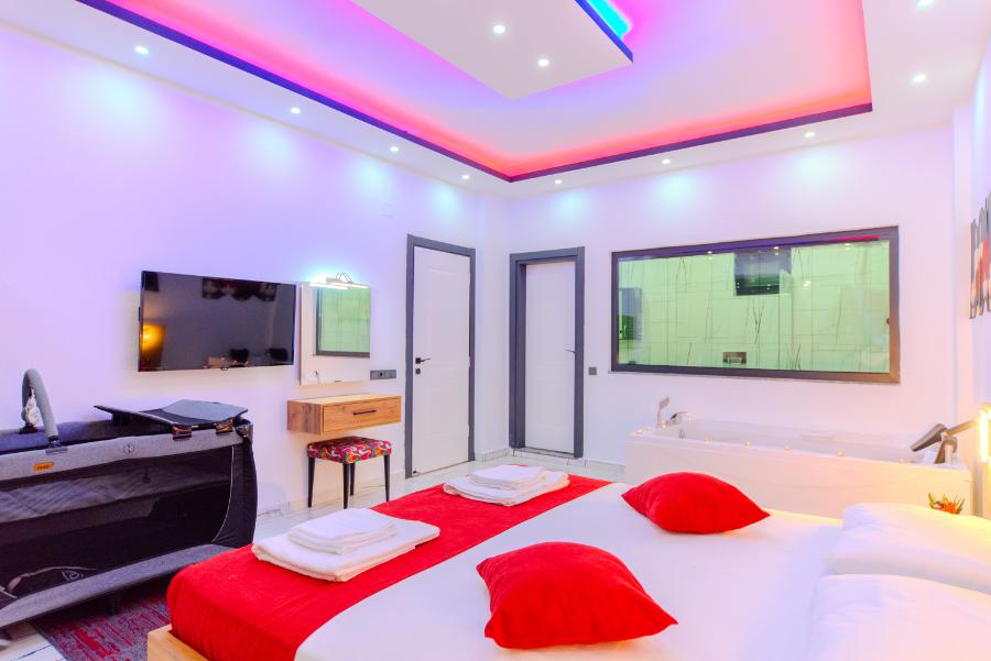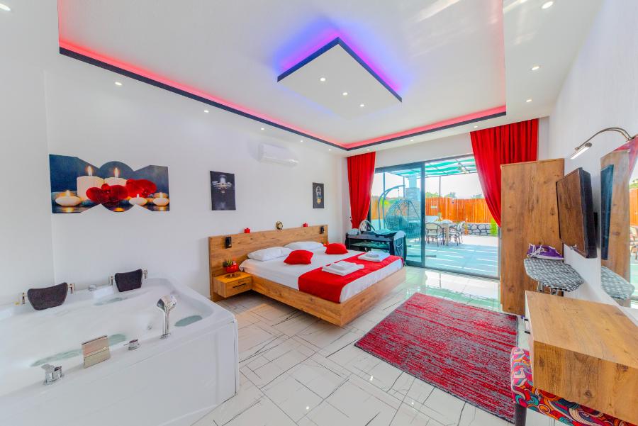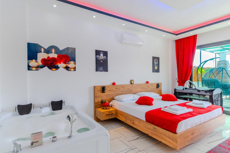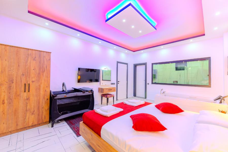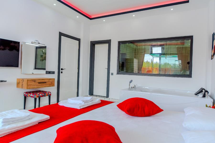 1. Yatak Odası: 1 çift kişilik yatak, jakuzi, klima, TV, banyo,