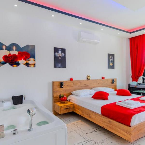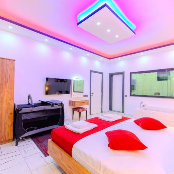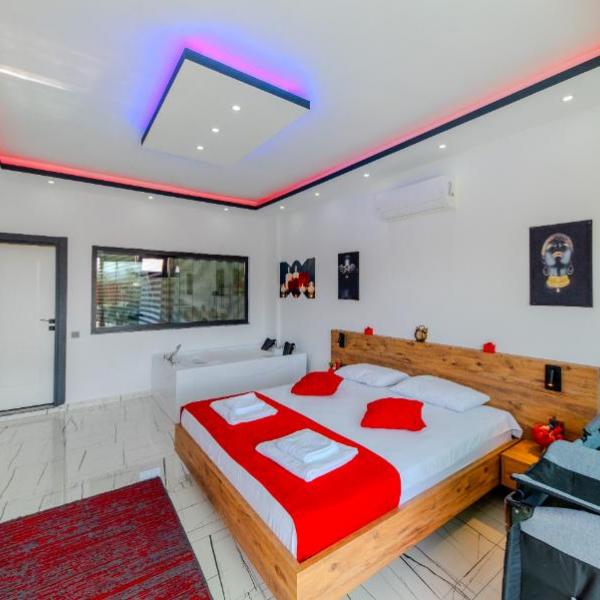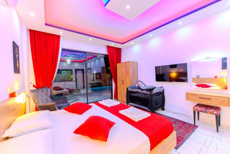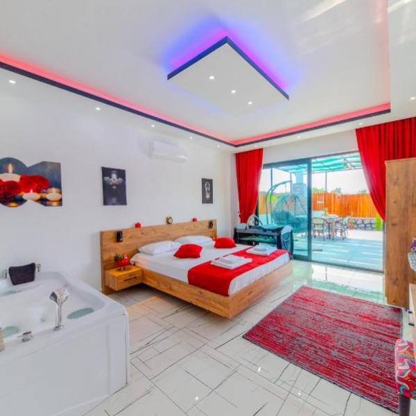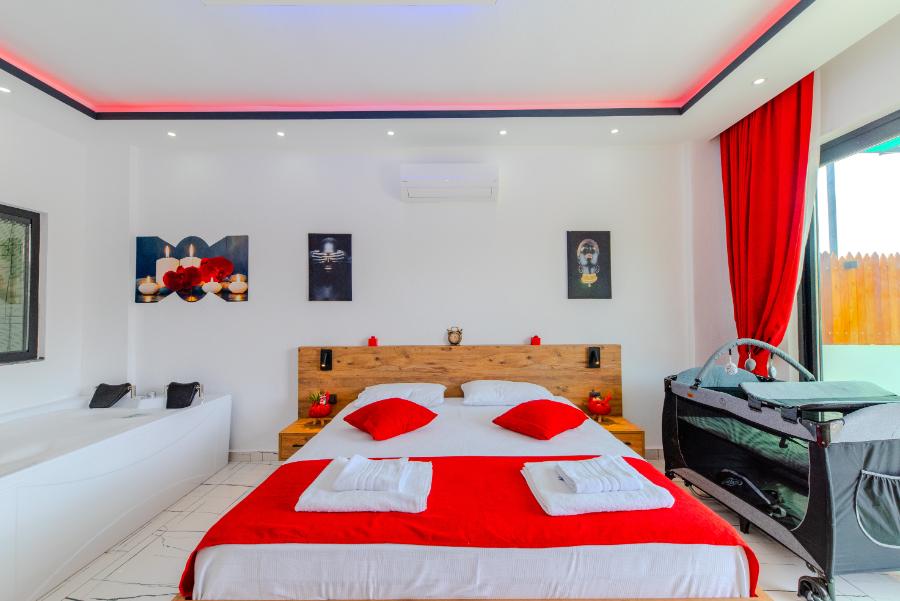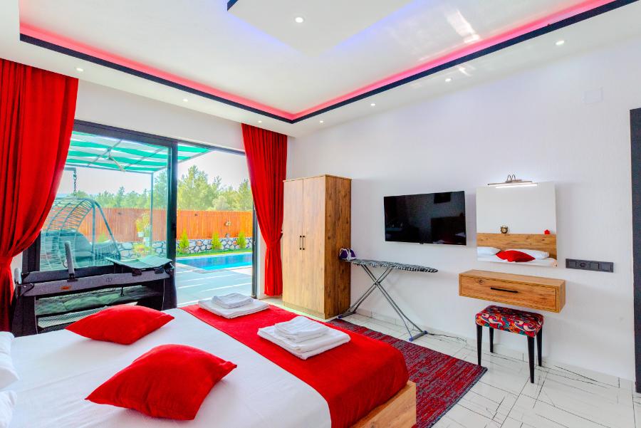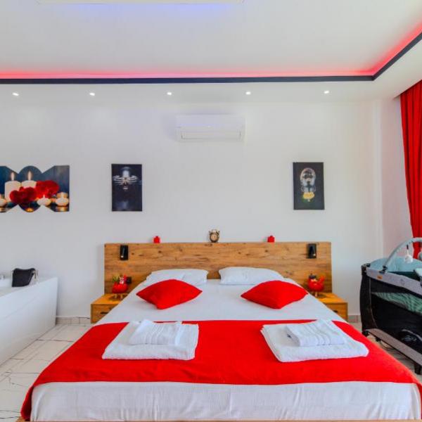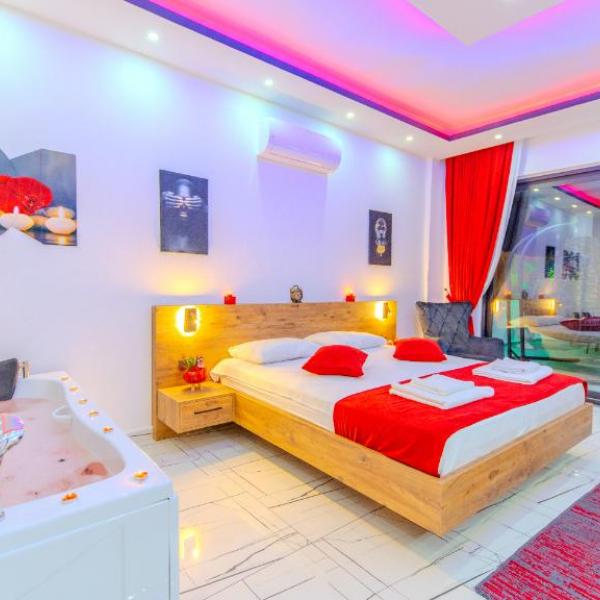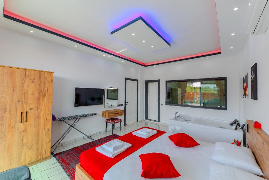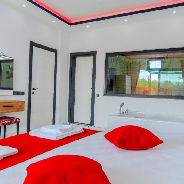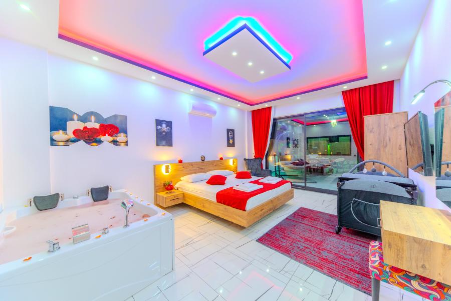 1. Yatak Odası: 1 çift kişilik yatak, jakuzi, klima, TV, banyo,