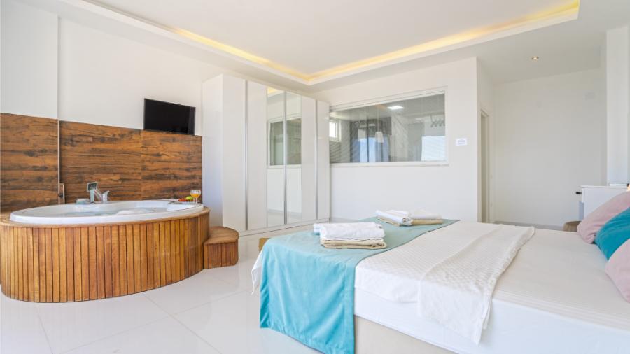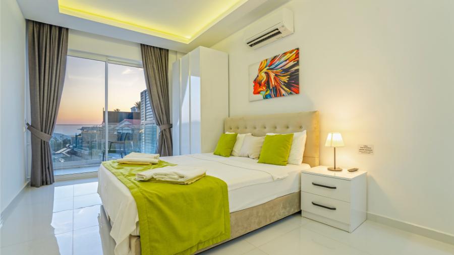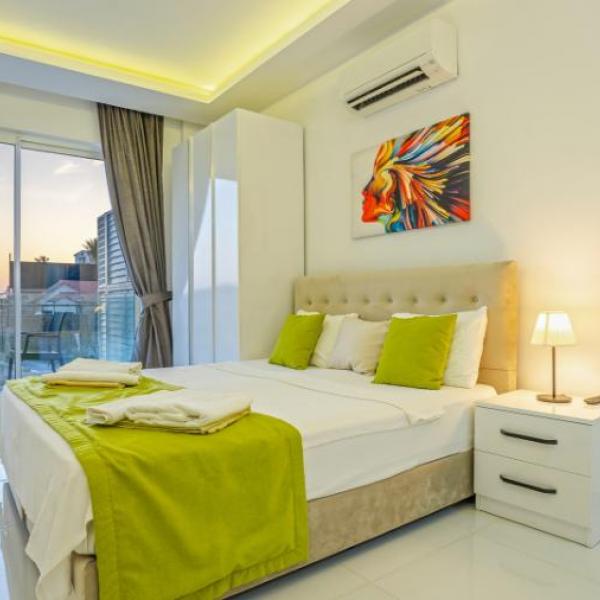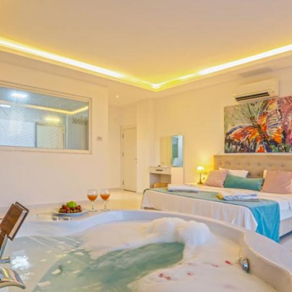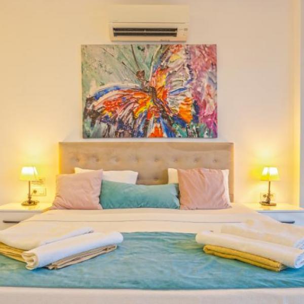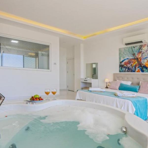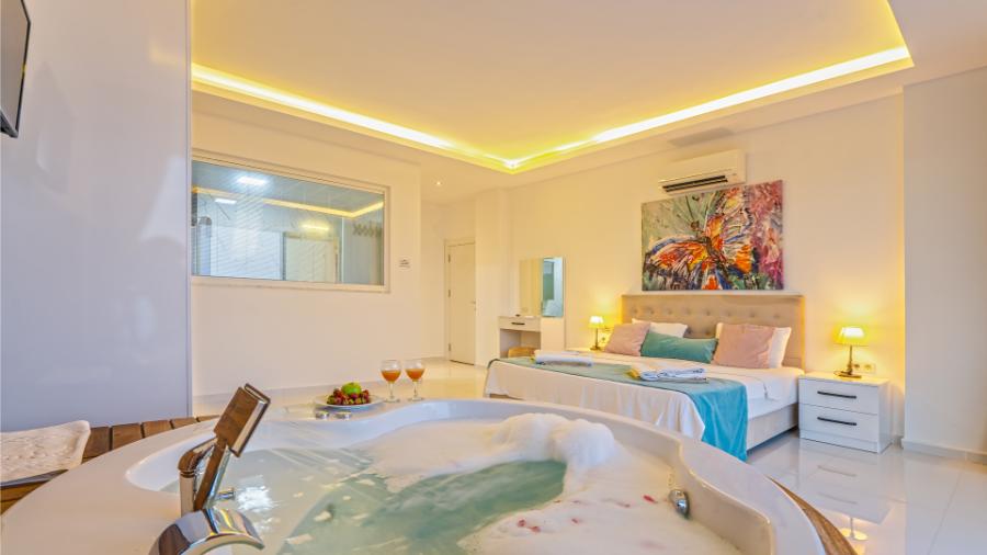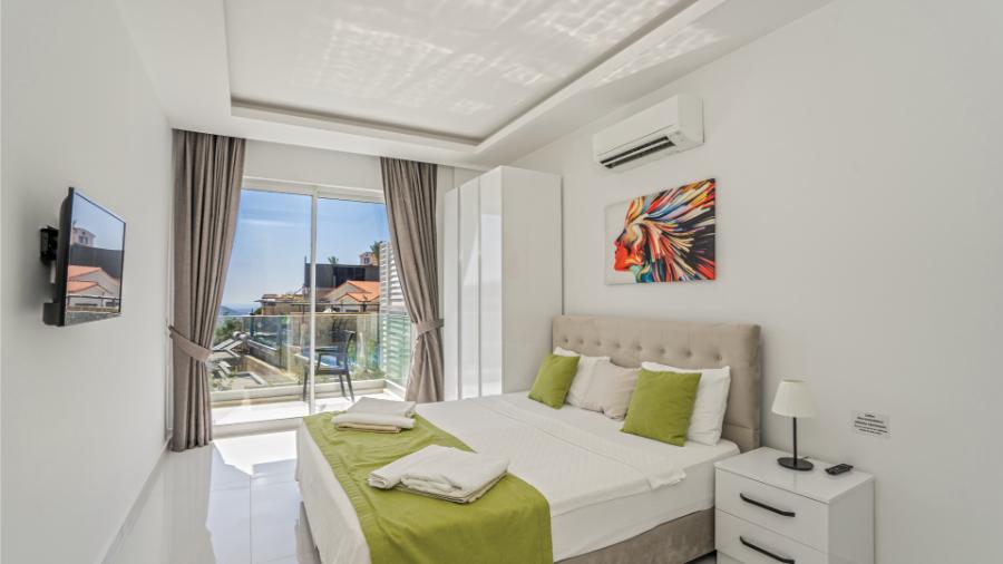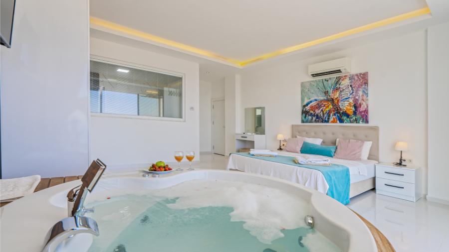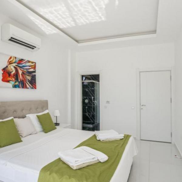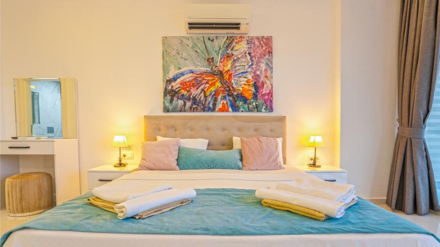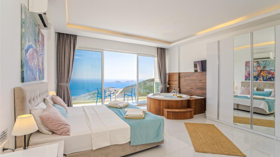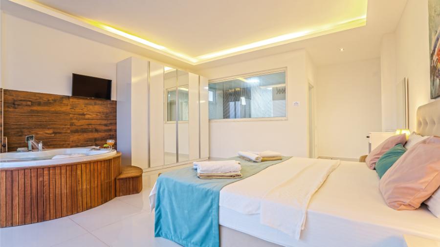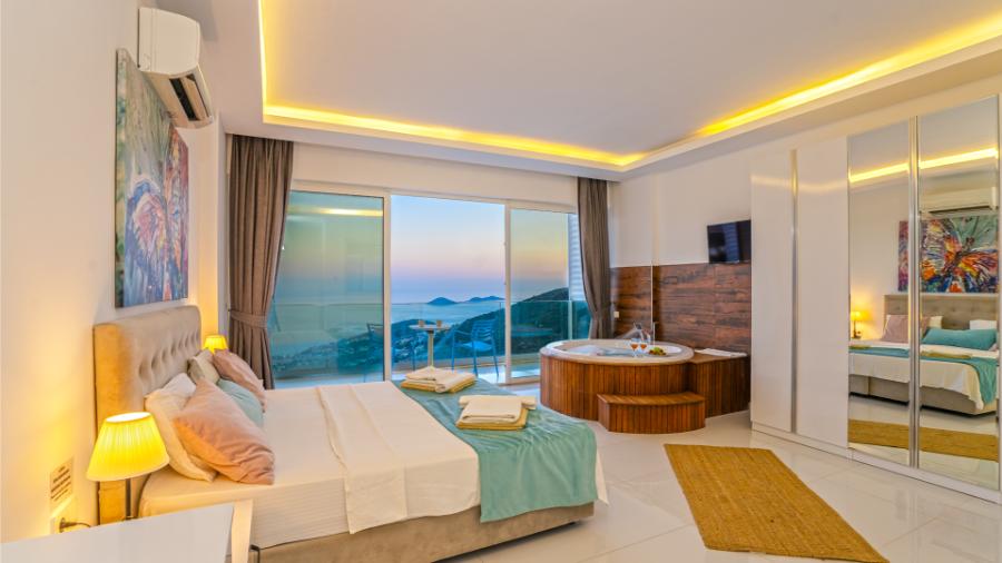 1.Yatak odası: 1 çift kisilik yatak, jakuzi, banyo, elbise dolabi, klima, komidin ,