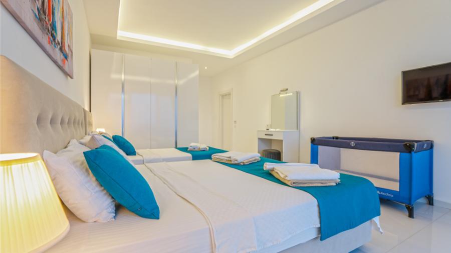 2.Yatak odası: 1 çift kisilik yatak ve tek kisilik yatak, banyo, elbise dolabi, klima, komidin,