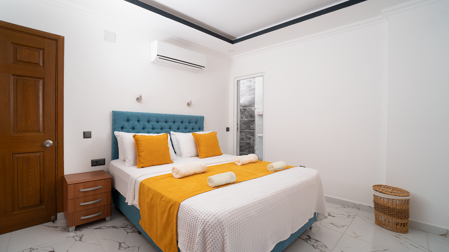 4. Yatak Odası : 1 adet çift kişilik yatak, klima, komodin, makyaj masası, elbise dolabı ve banyo tuvalet,