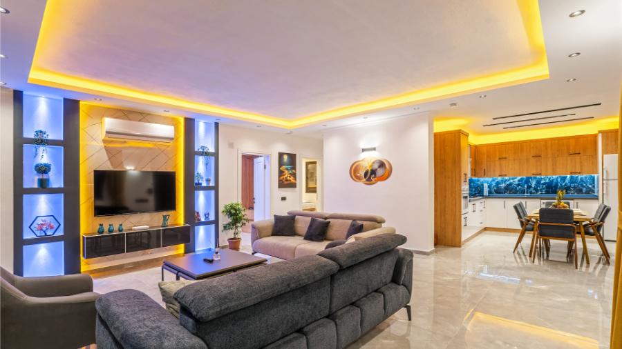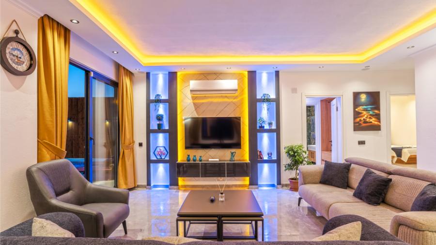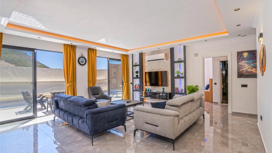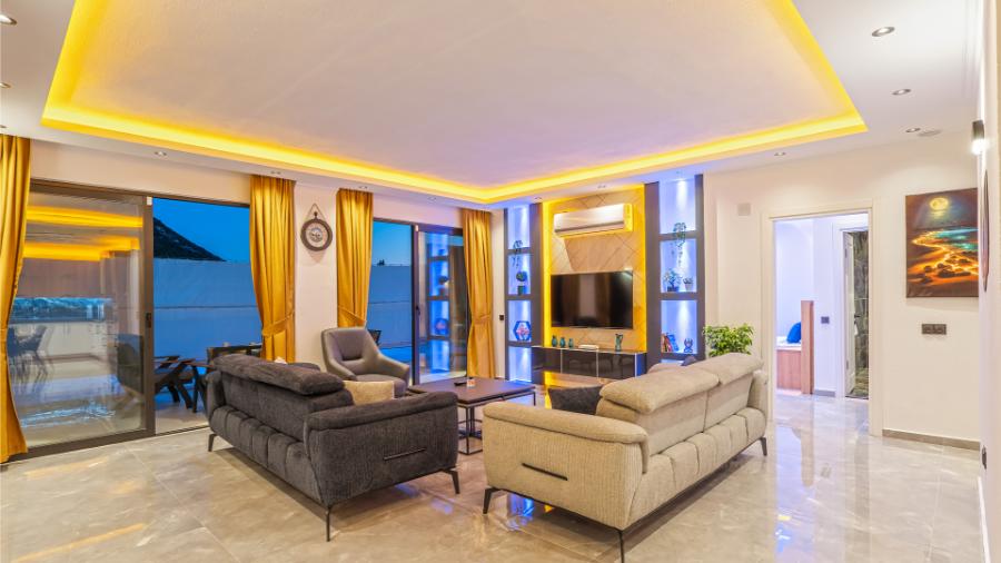 Salon: Oturma grubu, uydu alıcı, televizyon, klima,