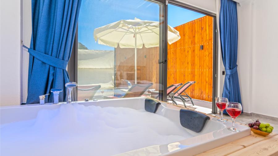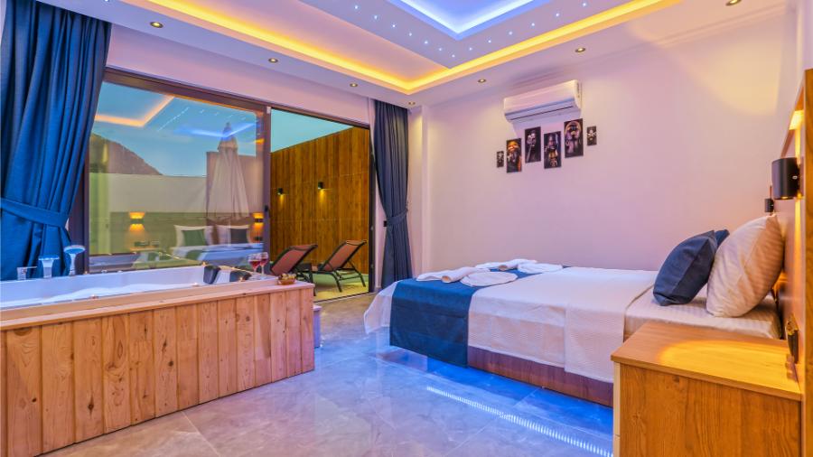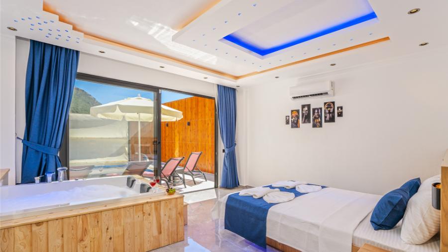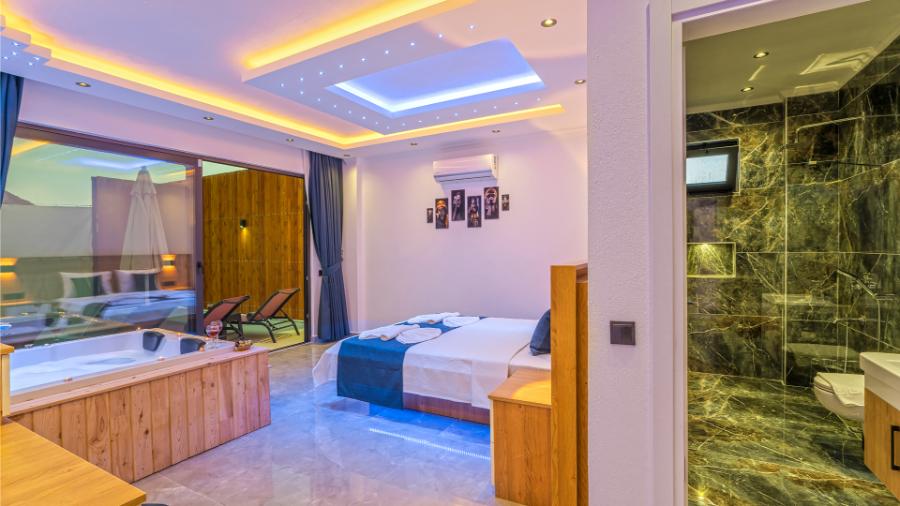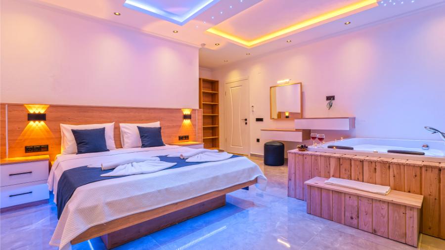 1. Yatak Odası: 1 çift kişilik yatak, jakuzi, klima, elbise dolabı, banyo ve tuvalet,