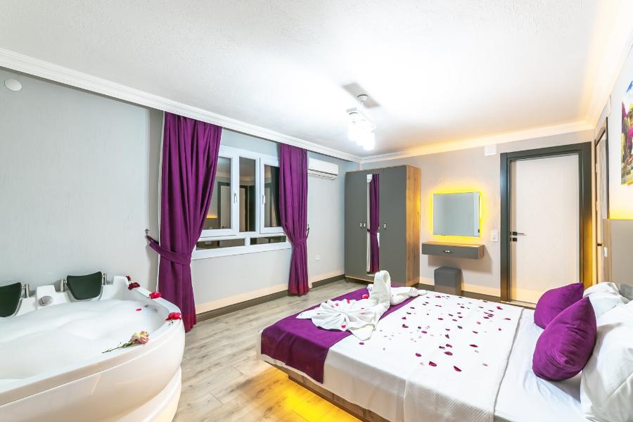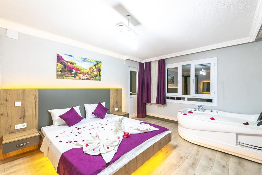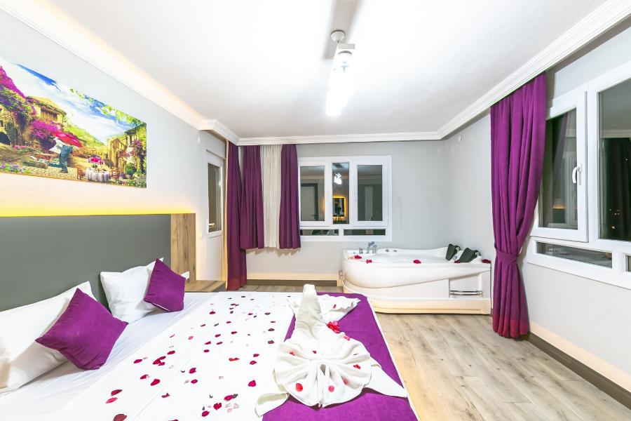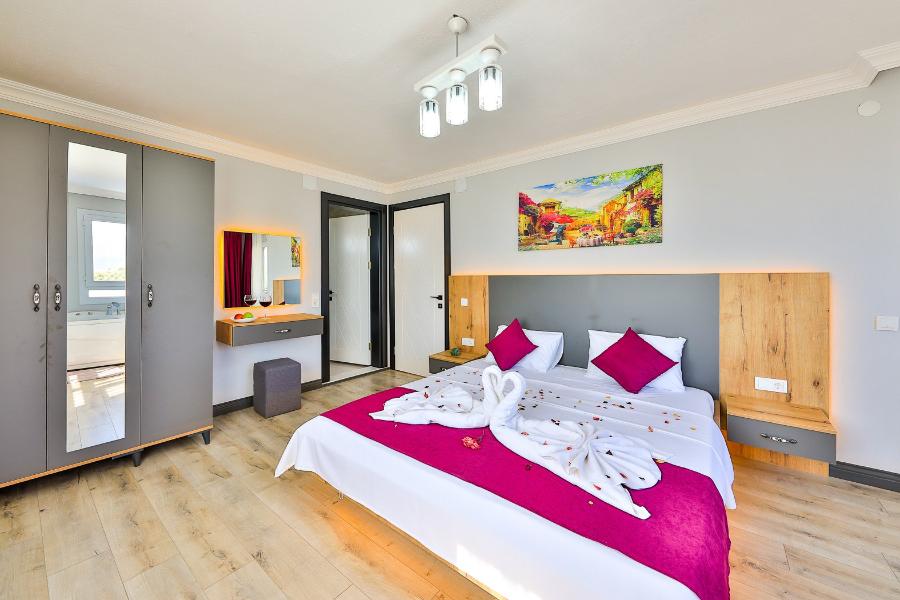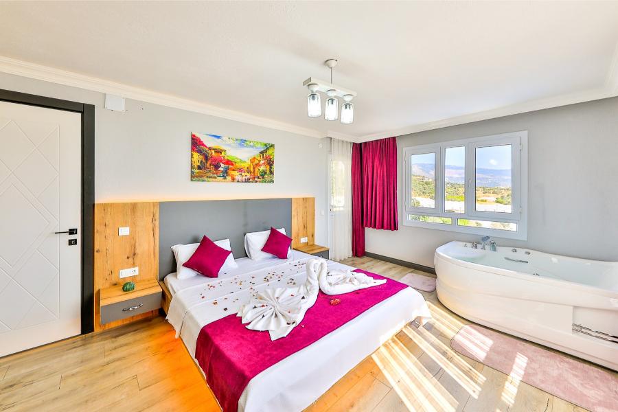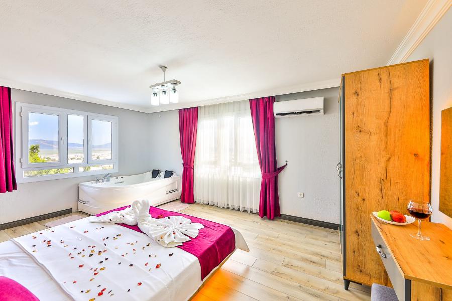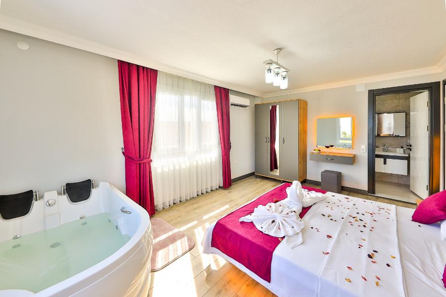 1. Yatak Odası: 1 çift kişilik yatak, jakuzi, klima, elbise dolabı, banyo ve tuvalet,