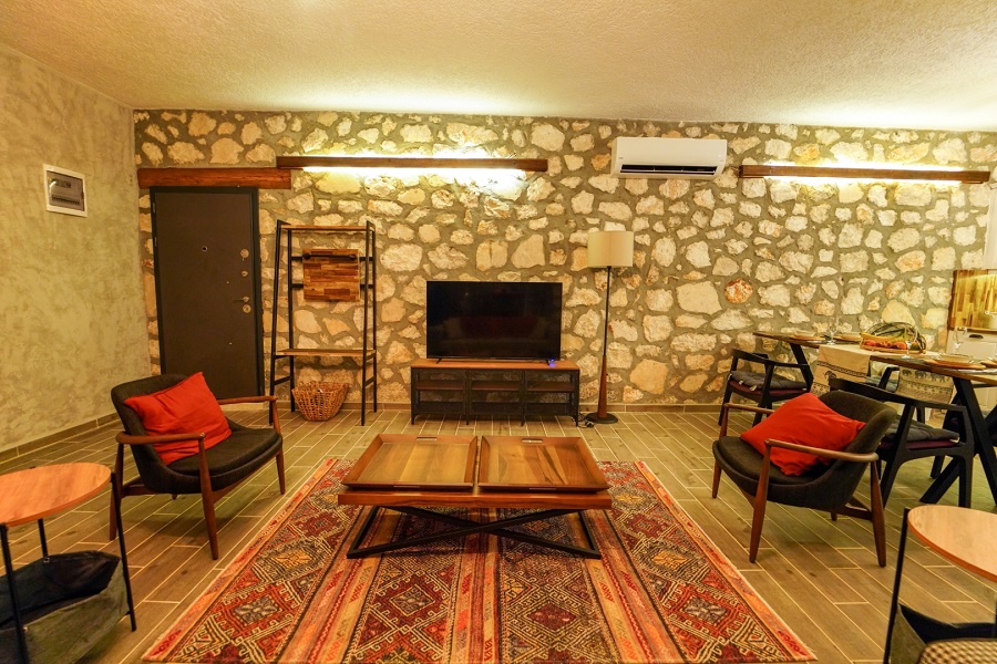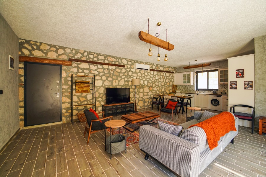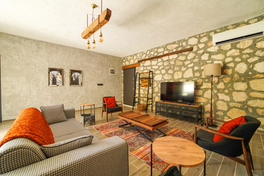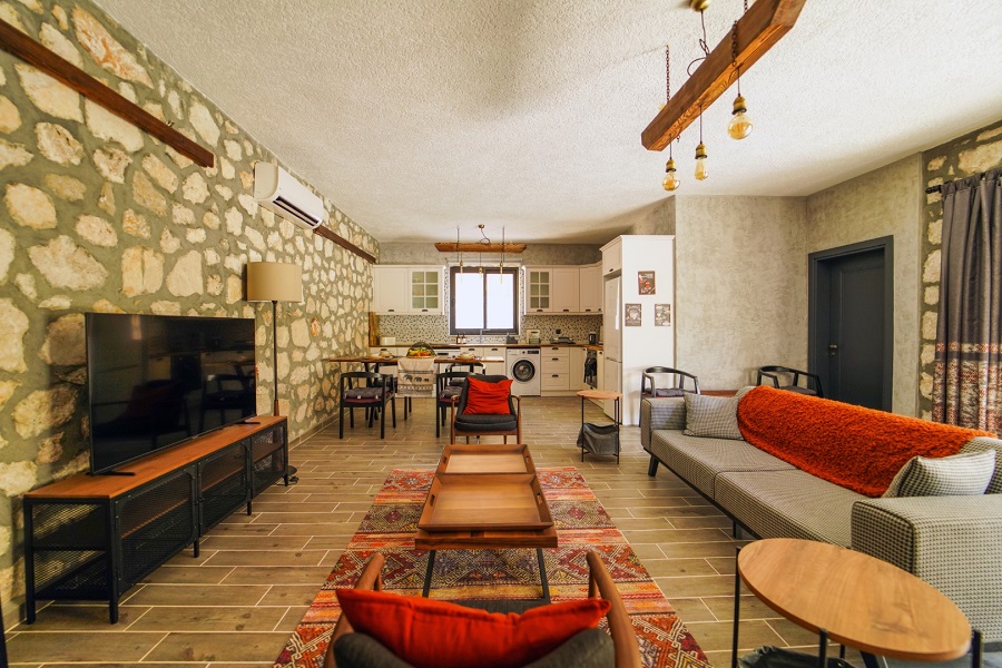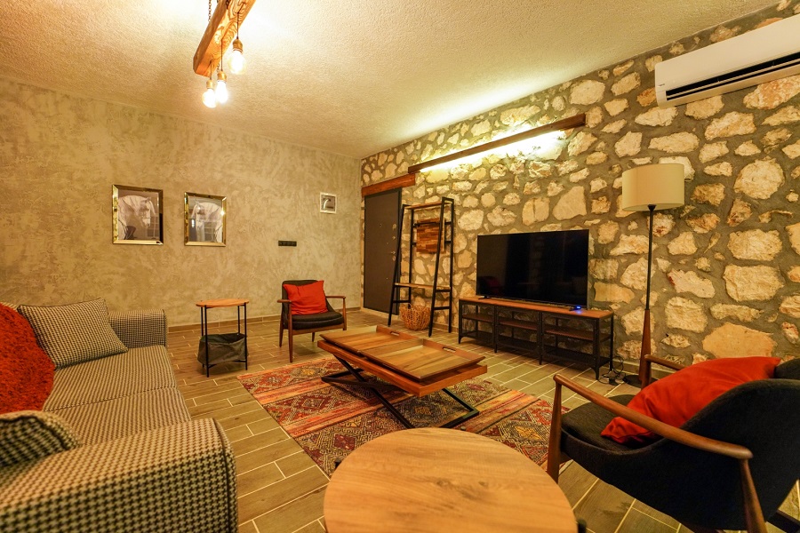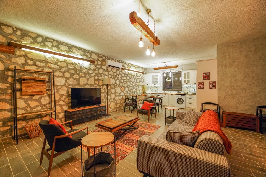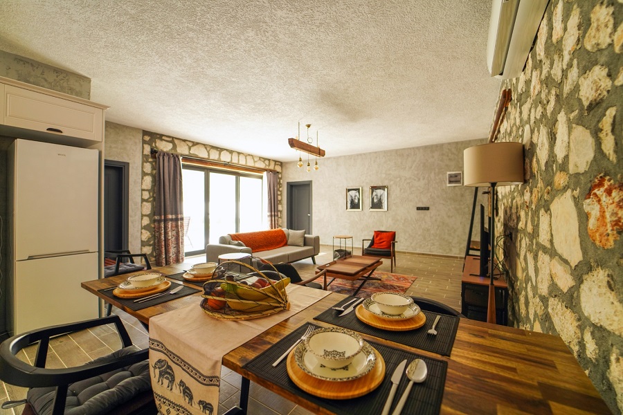 Salon: LCD TV, modern oturma grubu, yemek masası ve sandalyeler, kablosuz modem bulunmaktadır.