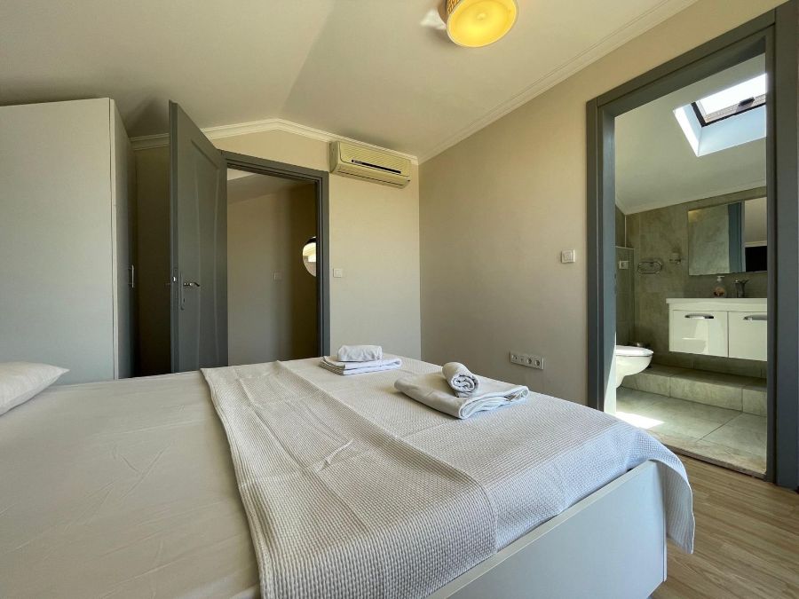1. yatak odası : 1 çift kişilik yatak, WC + duş, klima,
