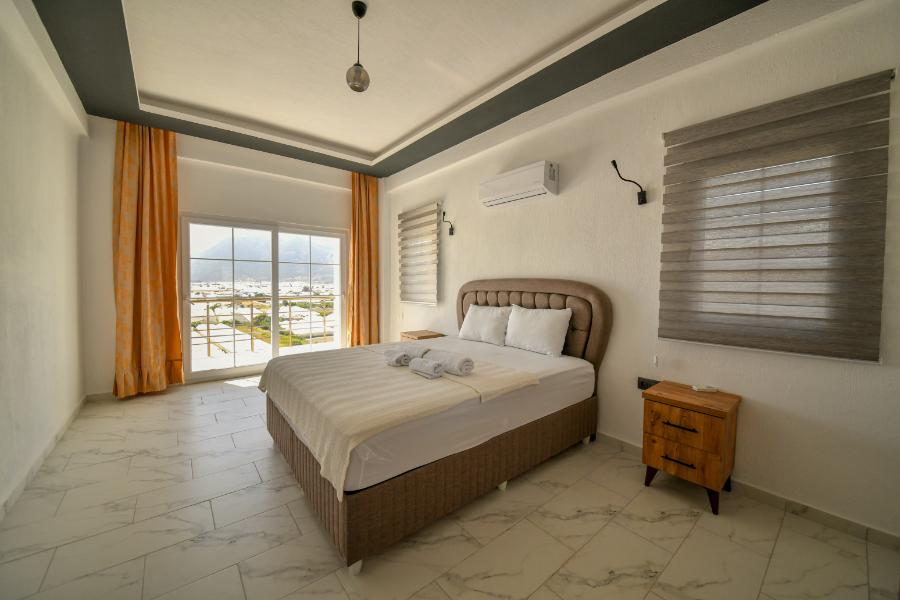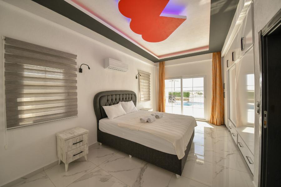 1.Yatak odası: Çift kişilik yatak, klima, televizyon, ebeveyn banyo, elbise dolabı,