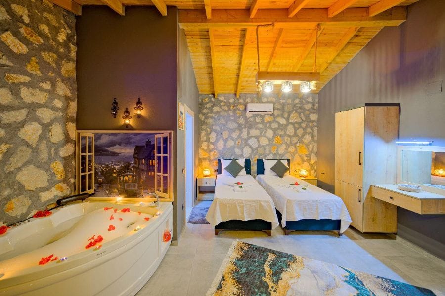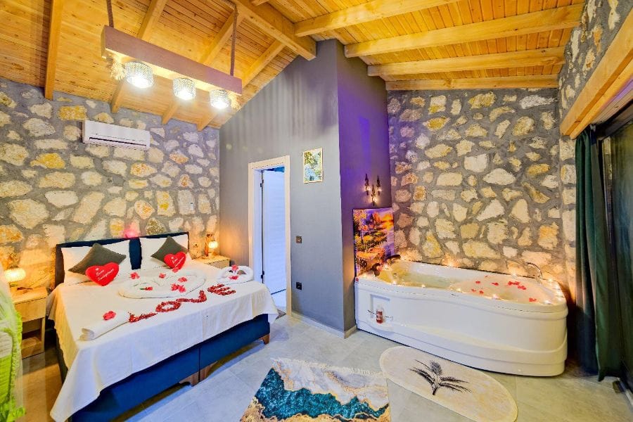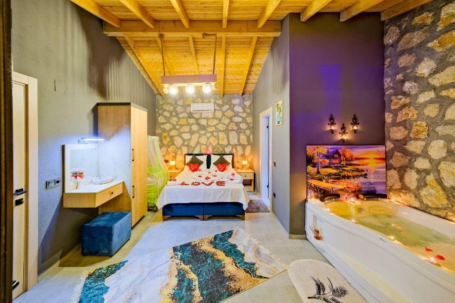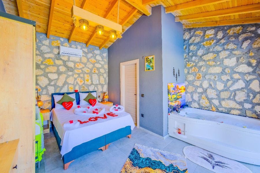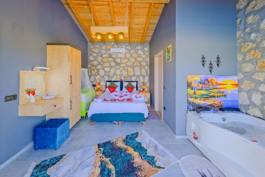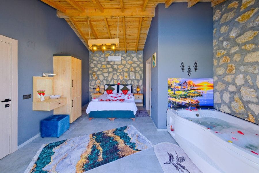 1. Yatak odası; 1 çift kişilik yatak, Gardırop, Komidin, Jakuzi, Televizyon, Klima, Makyaj masası