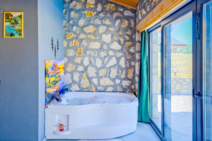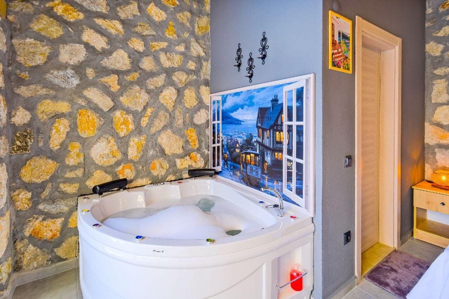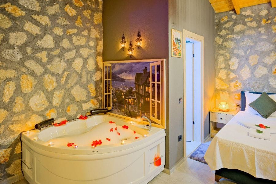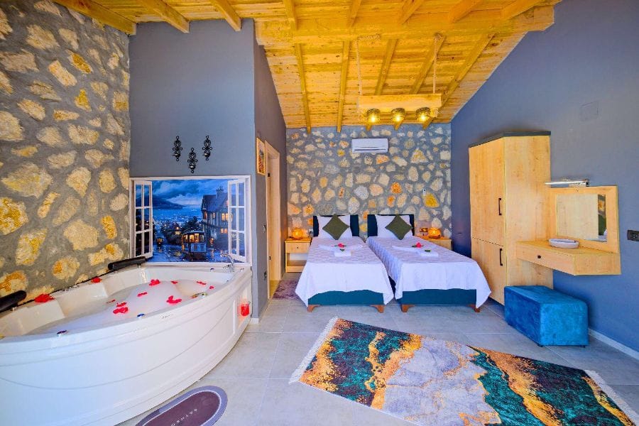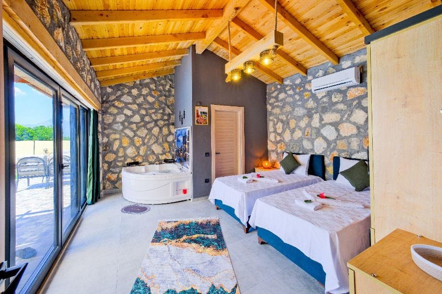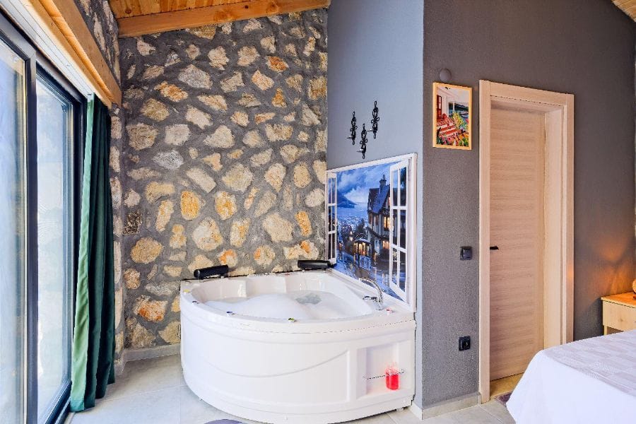 1. Yatak odası; 1 çift kişilik yatak, Gardırop, Komidin, Jakuzi, Televizyon, Klima, Makyaj masası