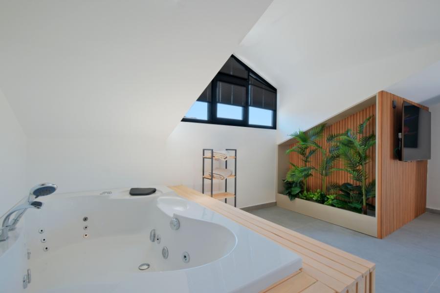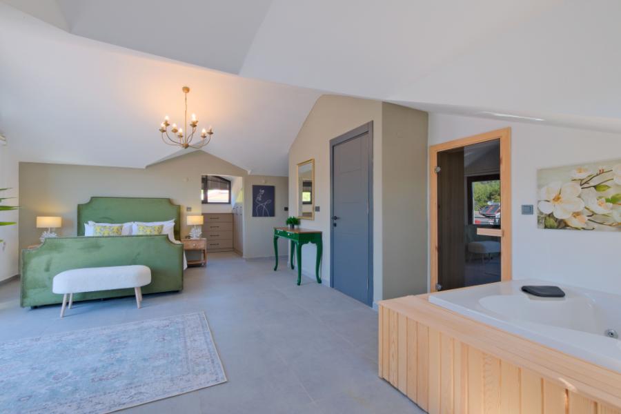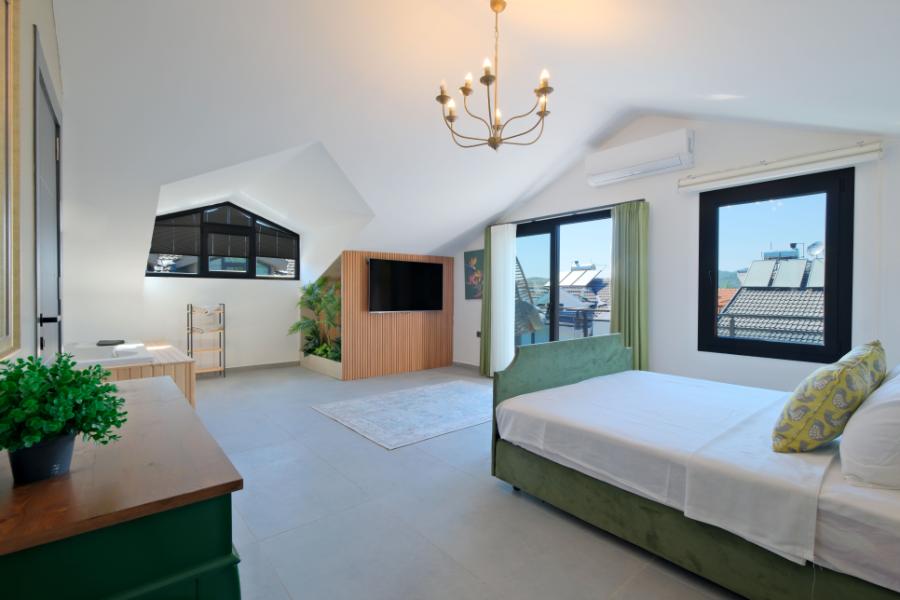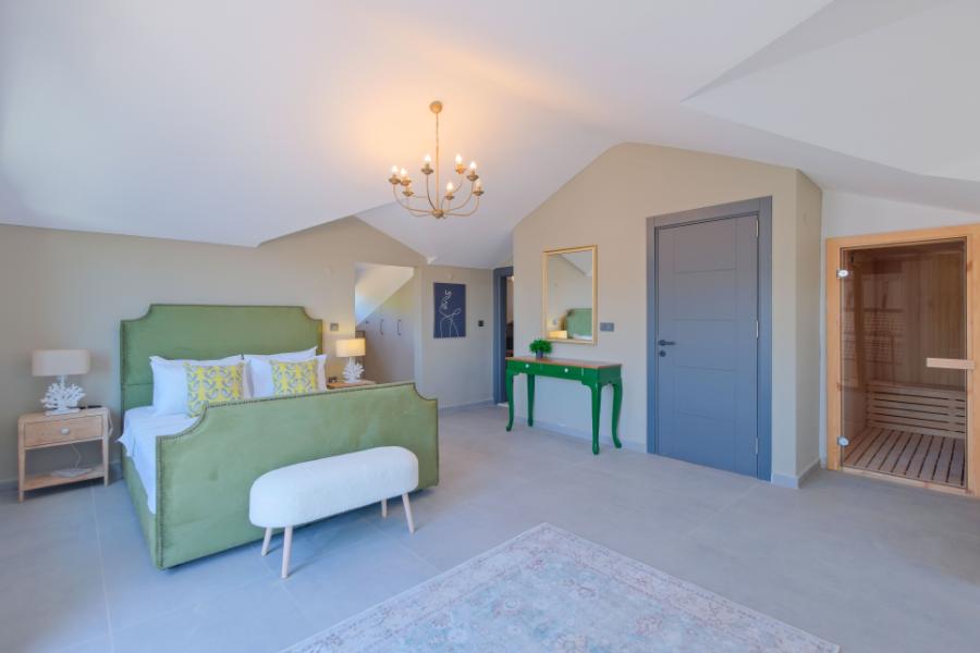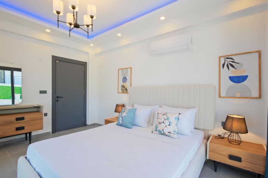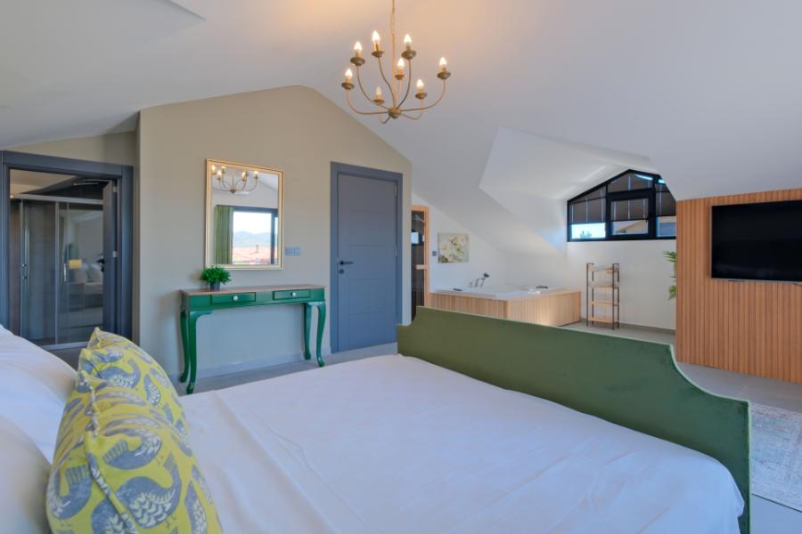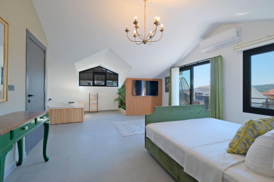 1. Yatak Odası: 1 çift kişilik yatak, elbise dolabı, makyaj masası, jakuzi, komodin, klima, banyo