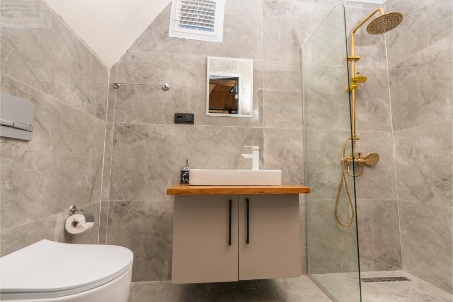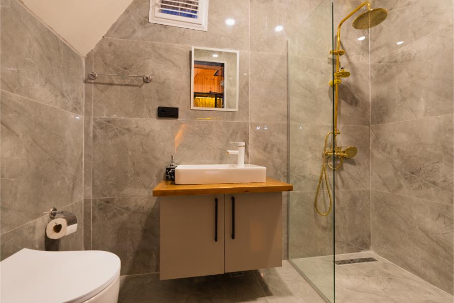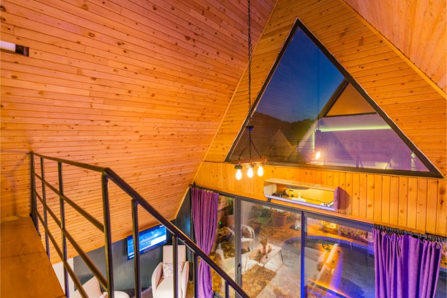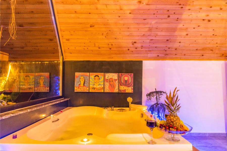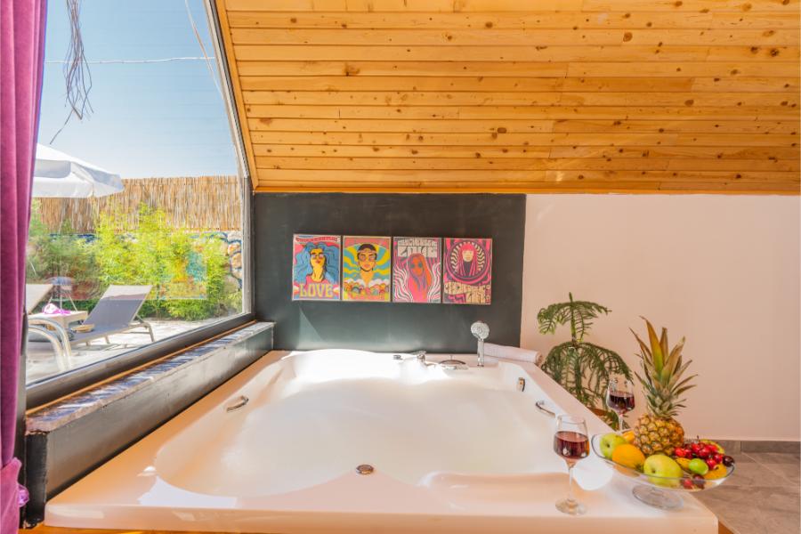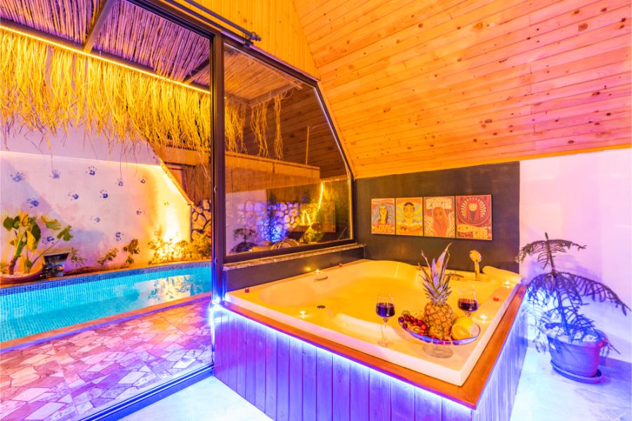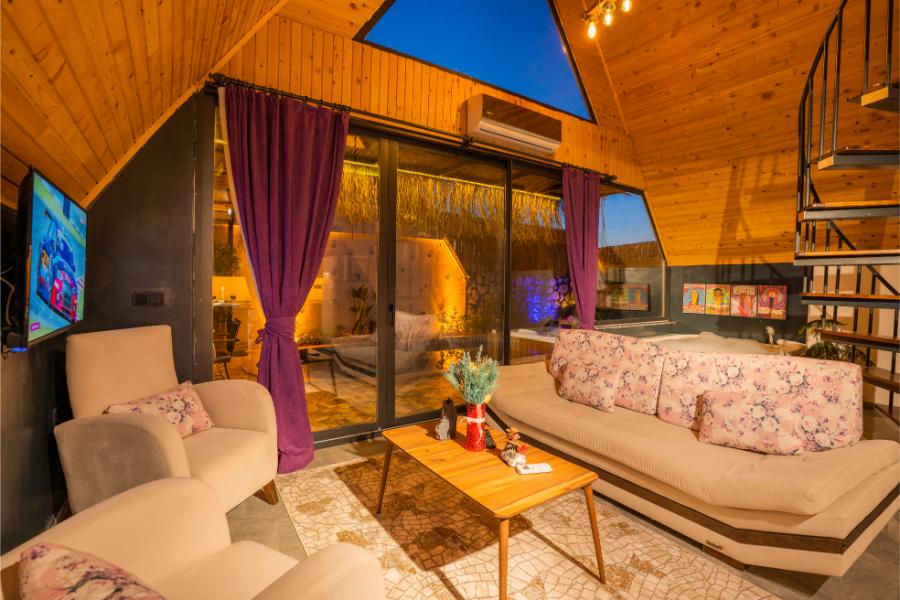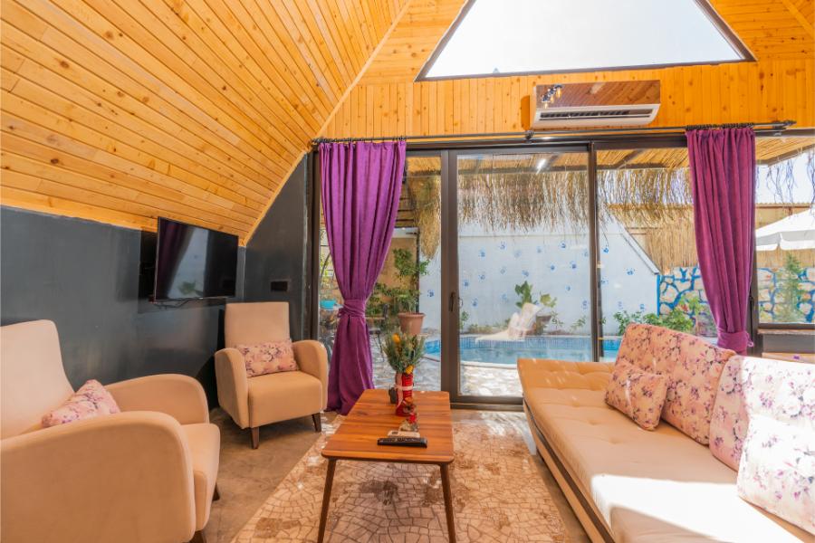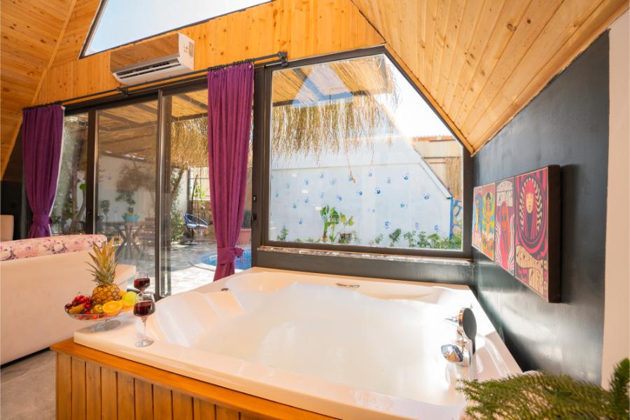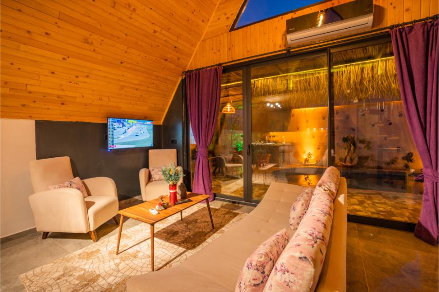 Salon: Oturma grubu, TV, klima, jakuzi, banyo,