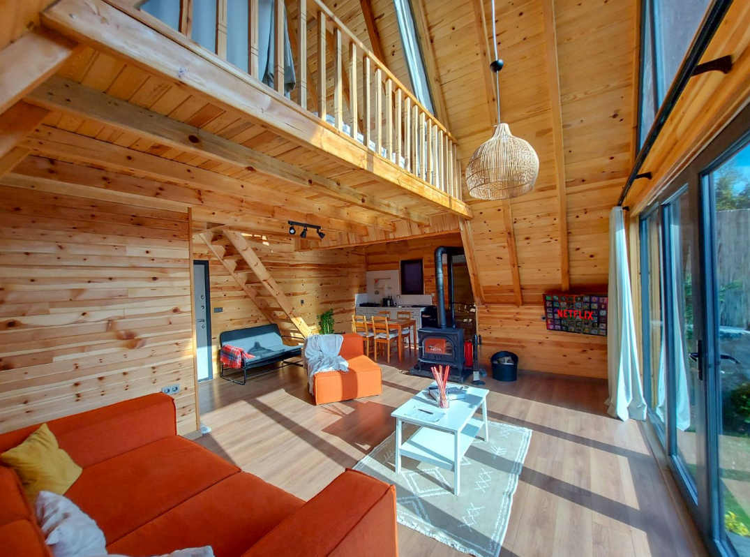 75 m² bungalovumuz 4 kişi konseptlidir. Üst katta yatak odasında çift kişilik yatak, alt katta salonda köşe koltuk ve açılır çift kişilik yatak bulunmaktadır.