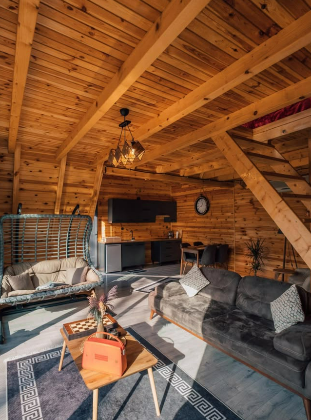 Sıcak ahşap detaylı ferah iç mekân, huzurlu bir atmosfer sunar.