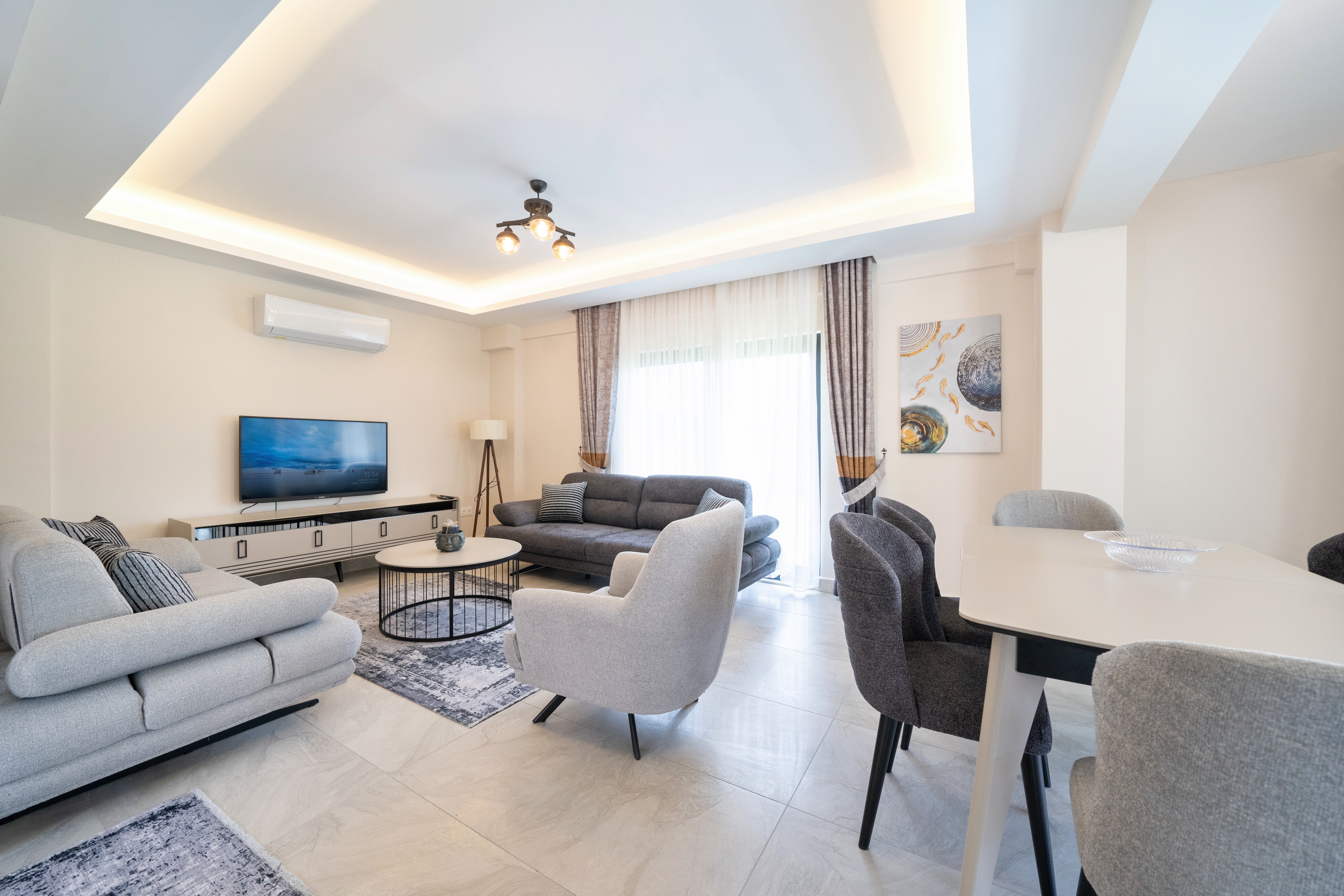 Salon: Oturma grubu, yemek masası, klima, TV,