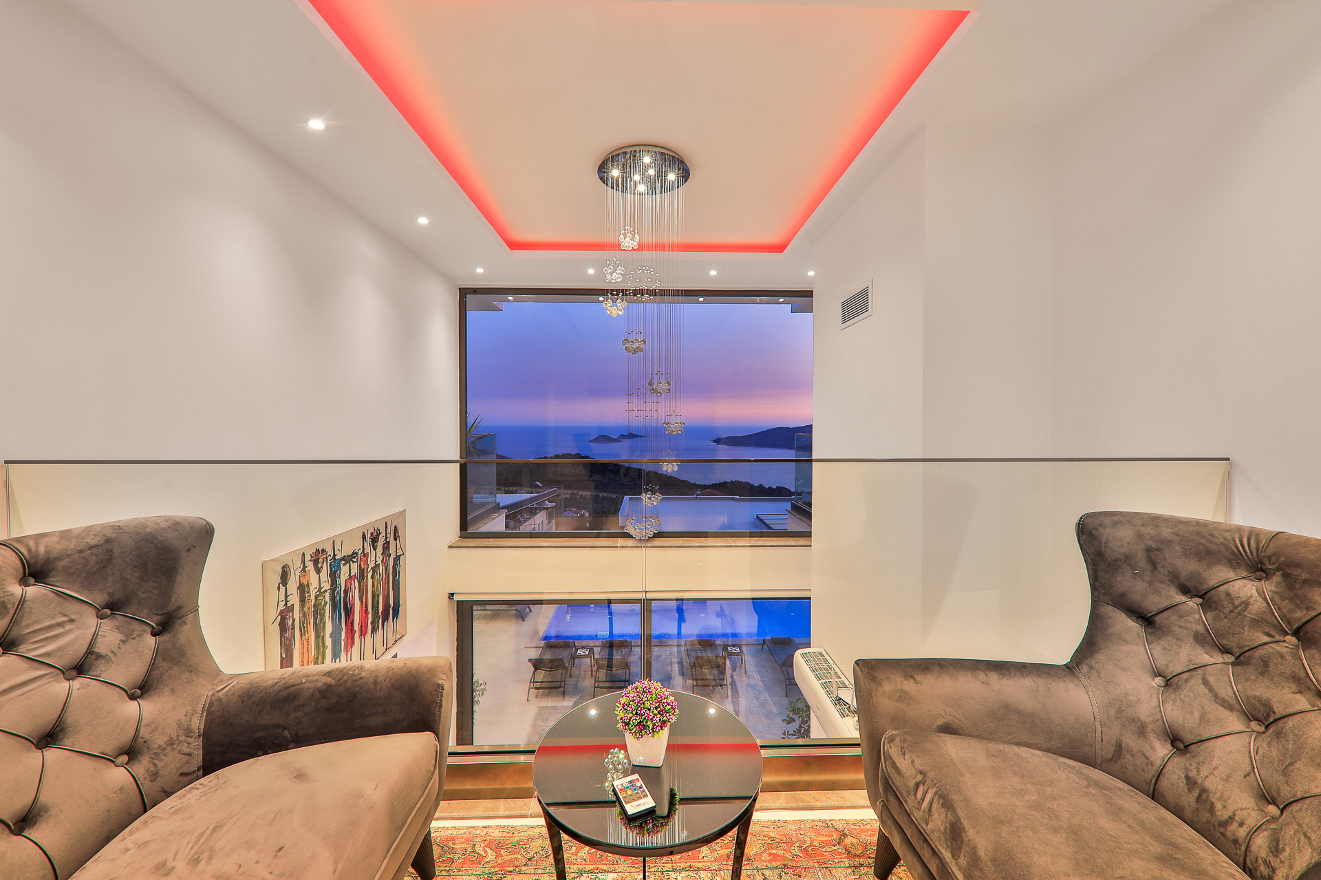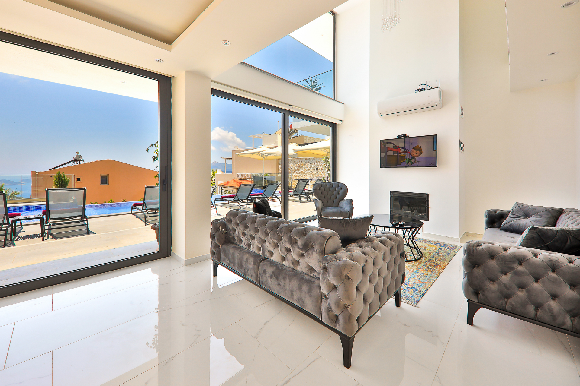 Salon: Deniz manzaralı salonunda oturma grubu, plazma TV, uydu alıcısı, klima, sehpa ve havuz başına çıkış bulunmaktadır.