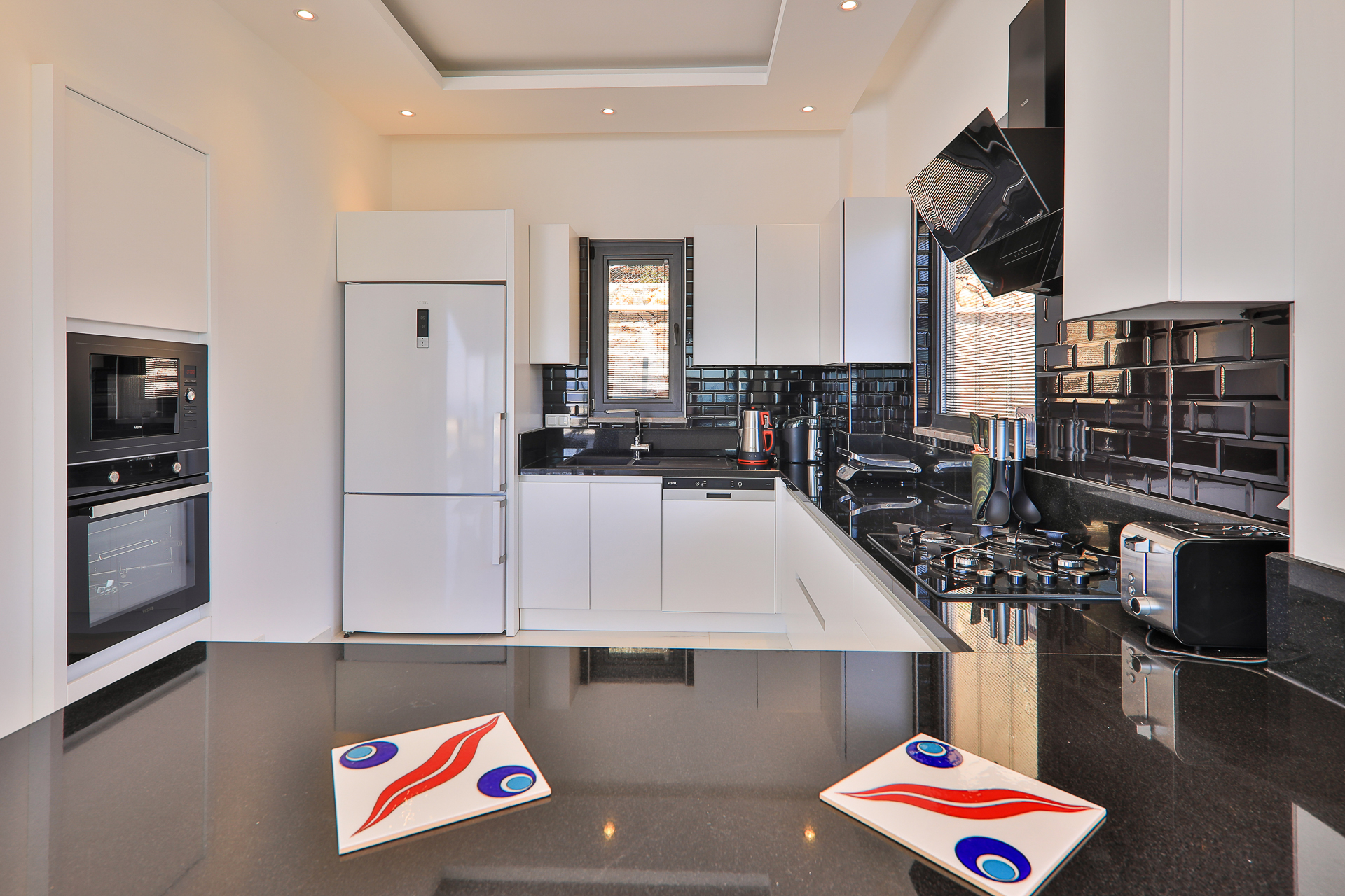 Mutfak: Buzdolabı, çamaşır makinesi, bulaşık makinesi, elektrikli su ısıtıcısı, mikrodalga fırın, ekmek kızartma makinesi, fırın, 4 lü ocak, yemek masası, yemek takımı ve mutfak araç gereçleri bulunmaktadır.