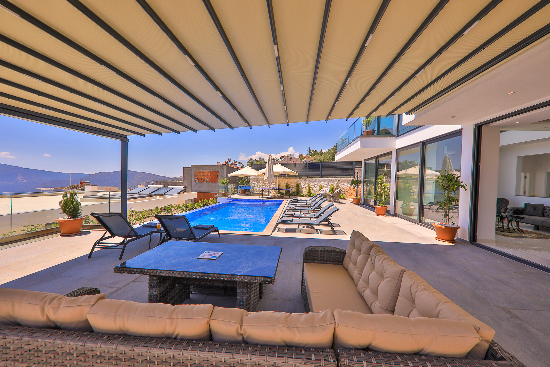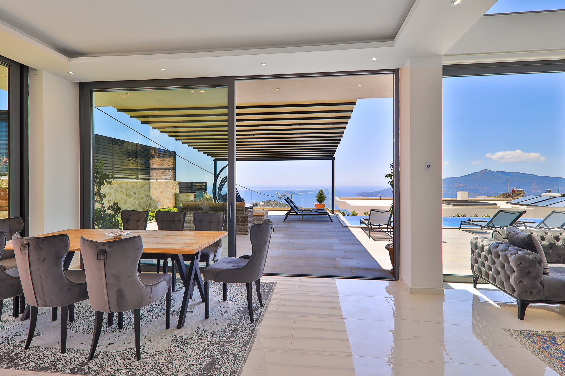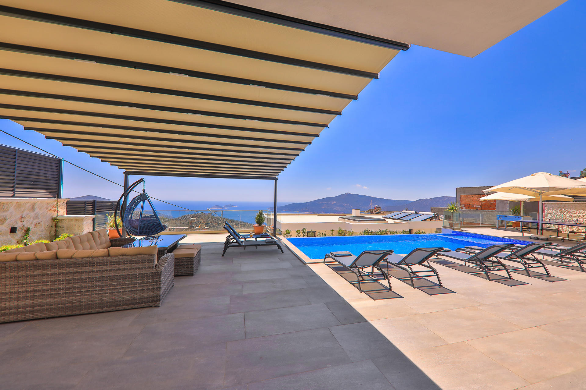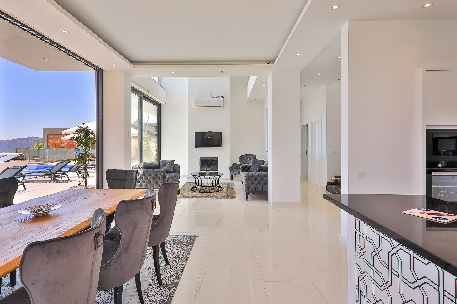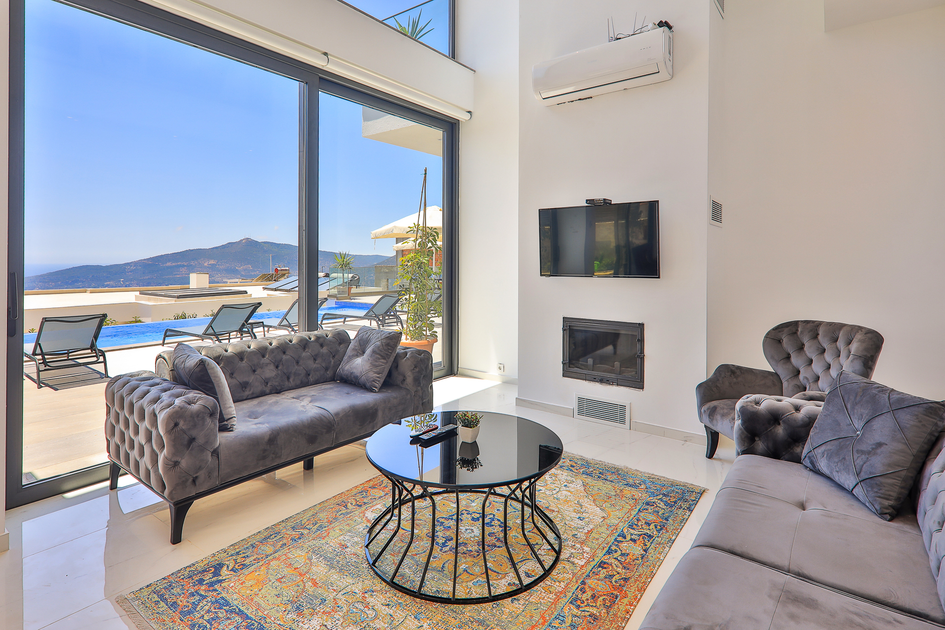 Salon: Deniz manzaralı salonunda oturma grubu, plazma TV, uydu alıcısı, klima, sehpa ve havuz başına çıkış bulunmaktadır.