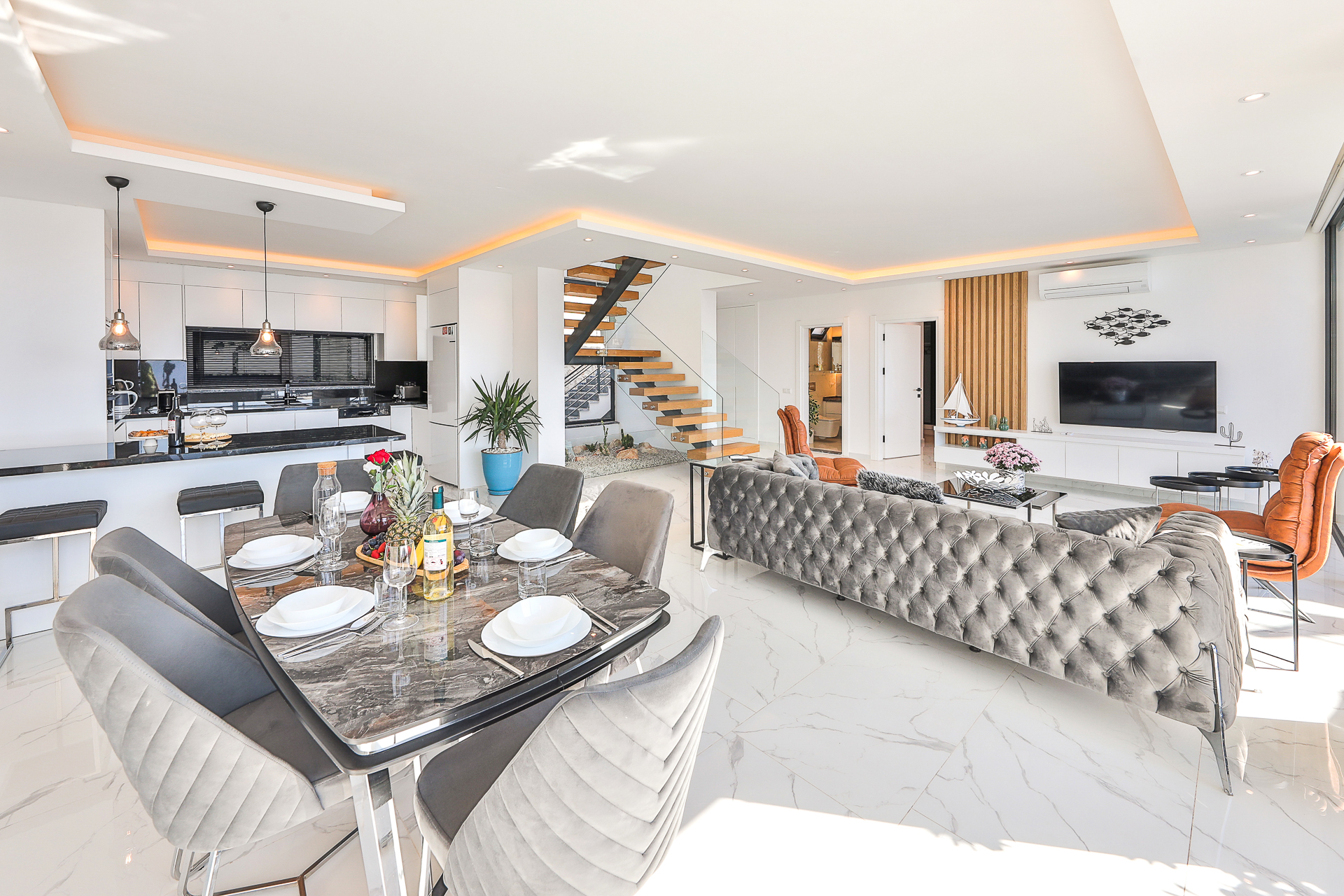 Salon: Oturma grubu, yemek masası ve sandalyeler, açık mutfak, tv, klima, sehpa bulunmaktadır.