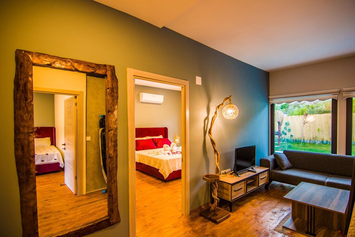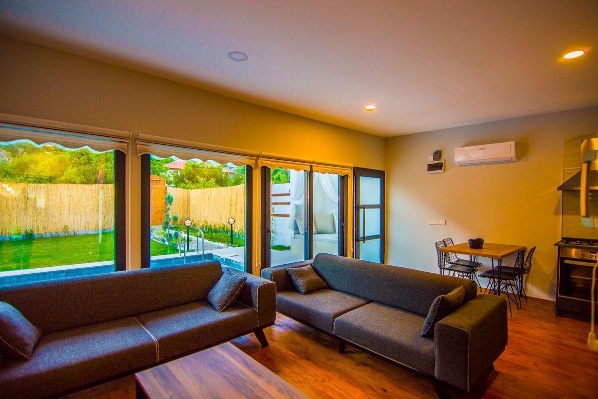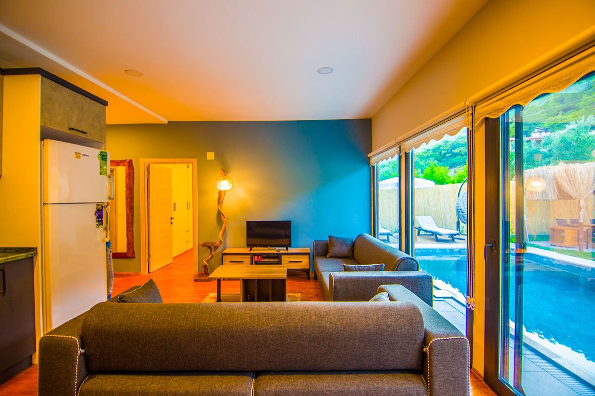 Salon: Oturma grupları, Led Tv, Klima, Yemek Masası, full doğa manzarası,