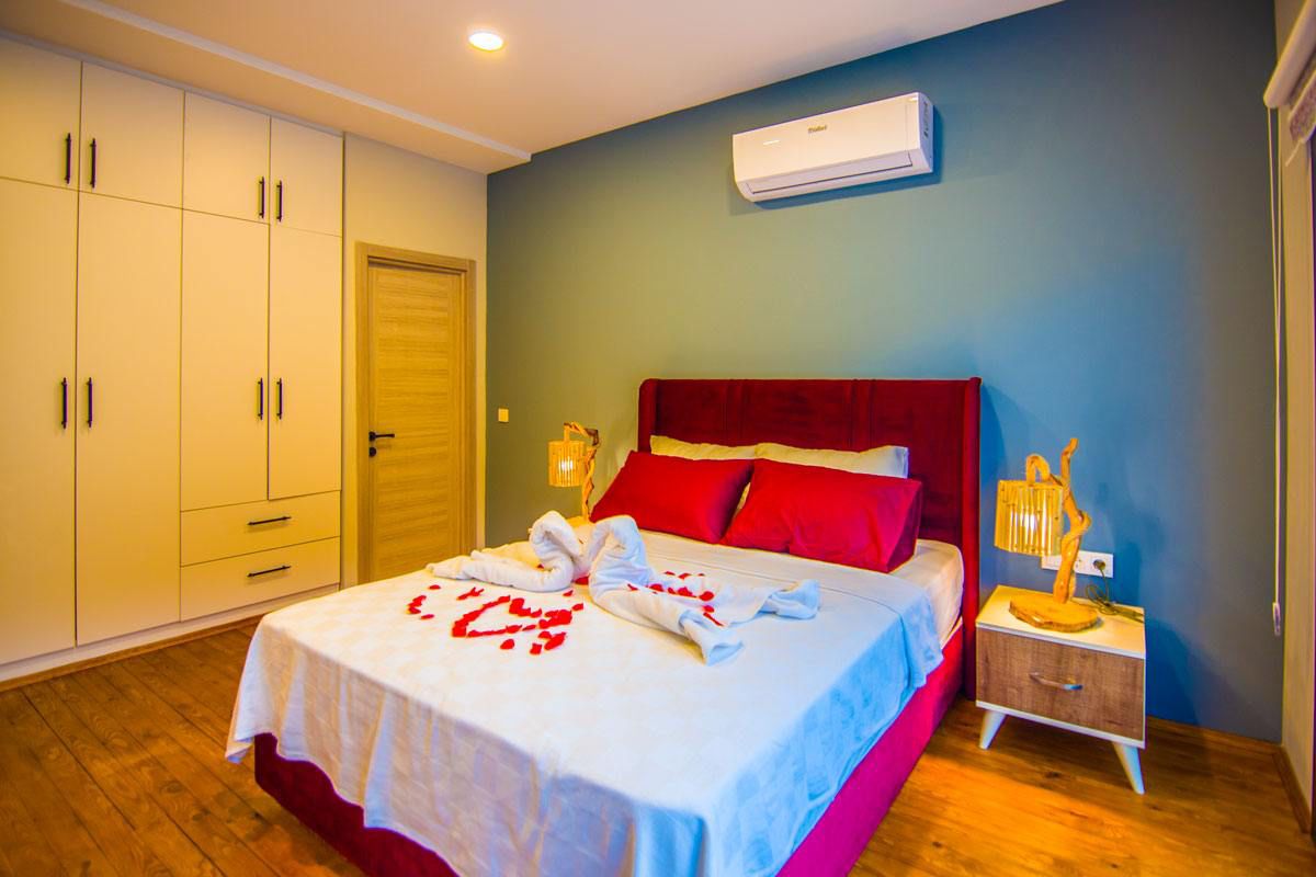 1.Yatak Odası: 1 çift kişilik yatak, gardırop, klima, ve makyaj masası, banyo