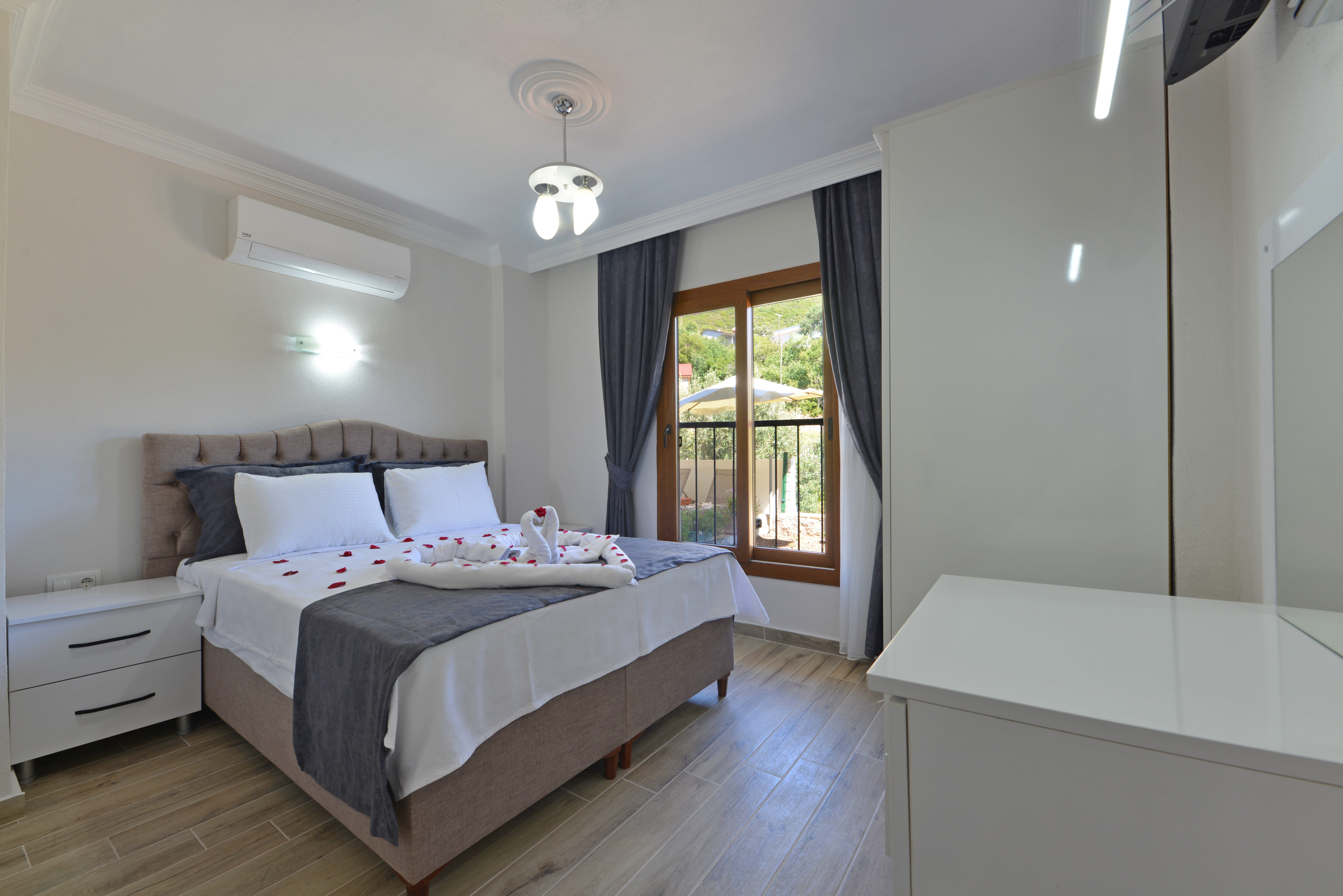 3.Yatak odası 1 çift kişilik yatak + elbise dolabı + komodin + makyaj masası + banyo