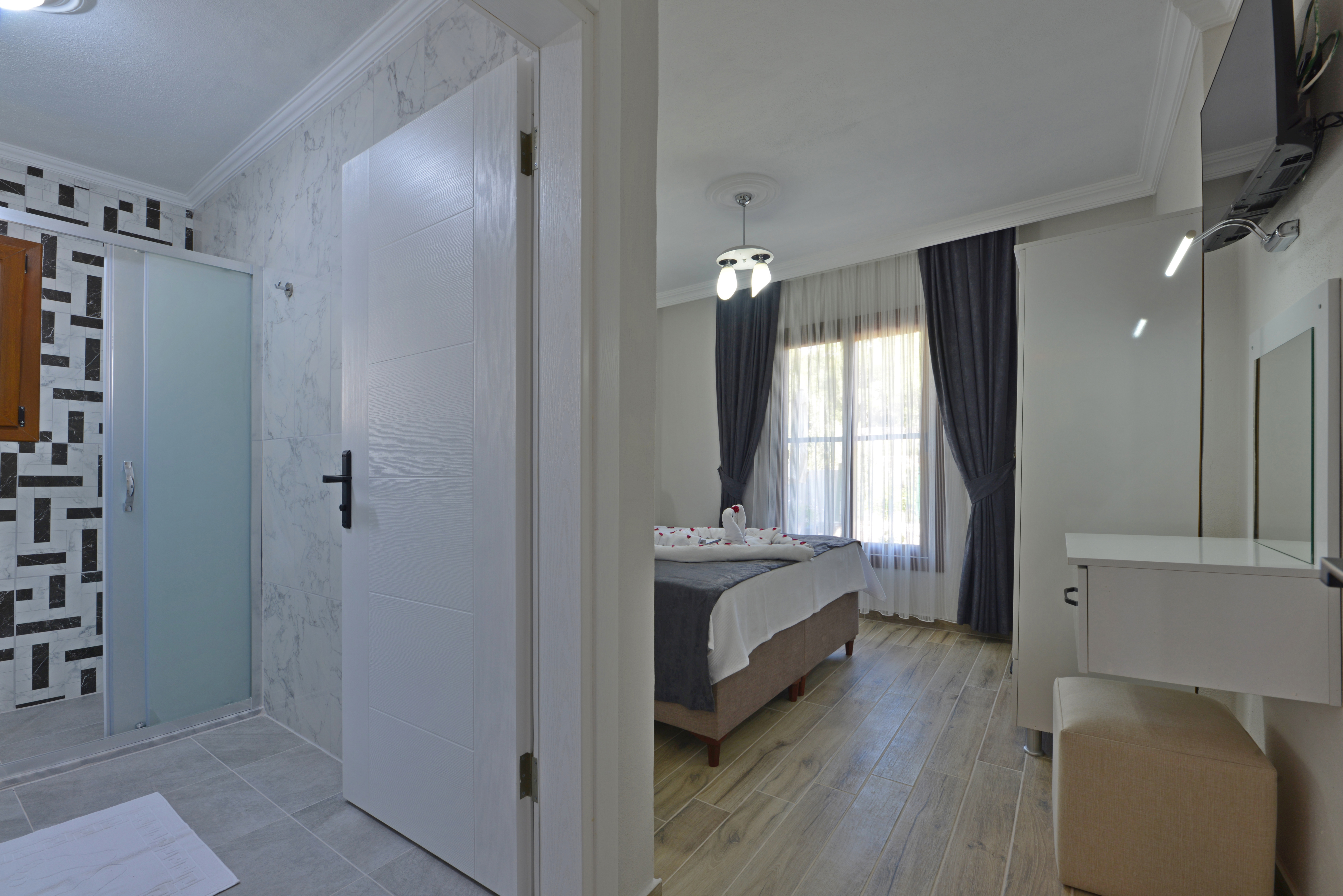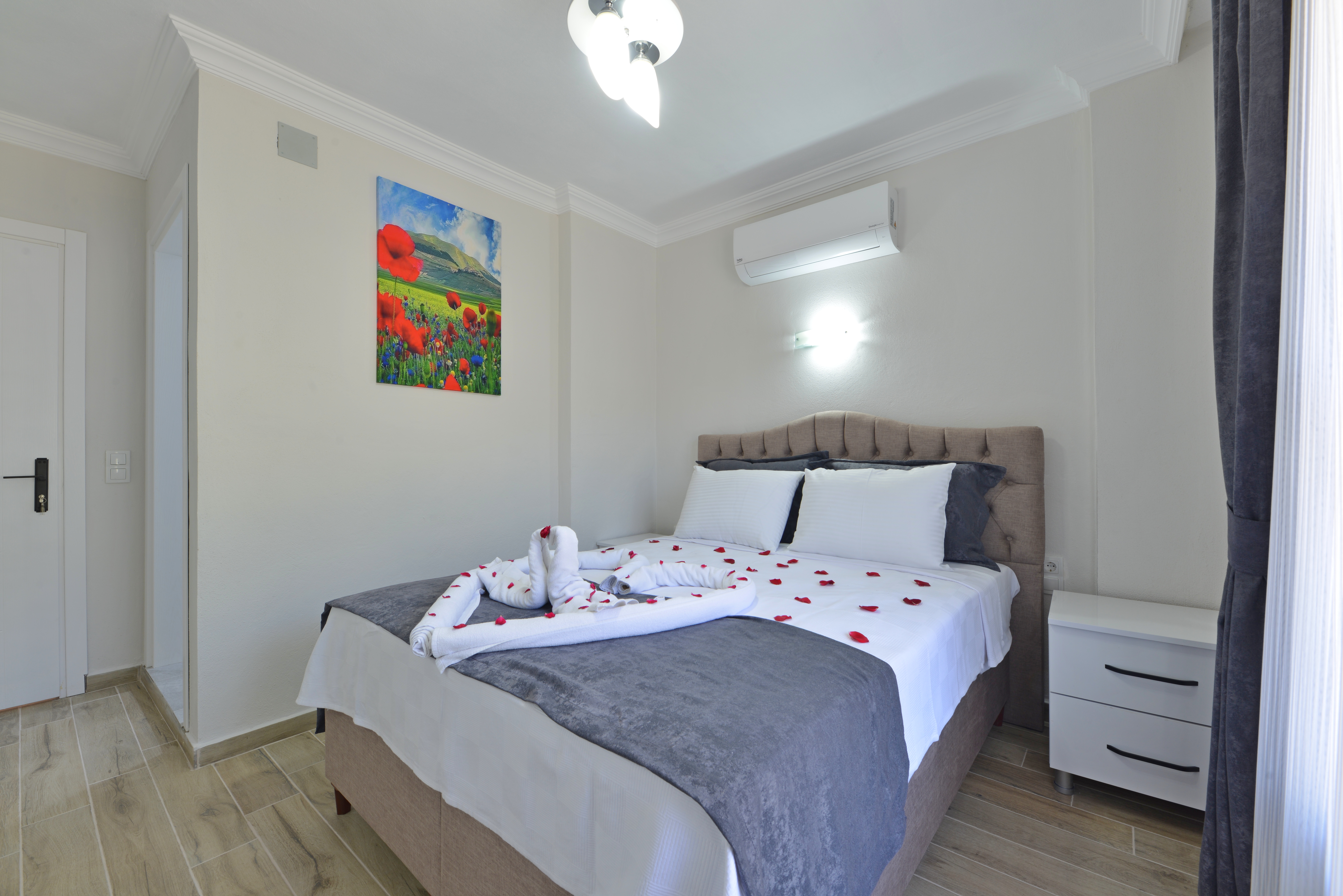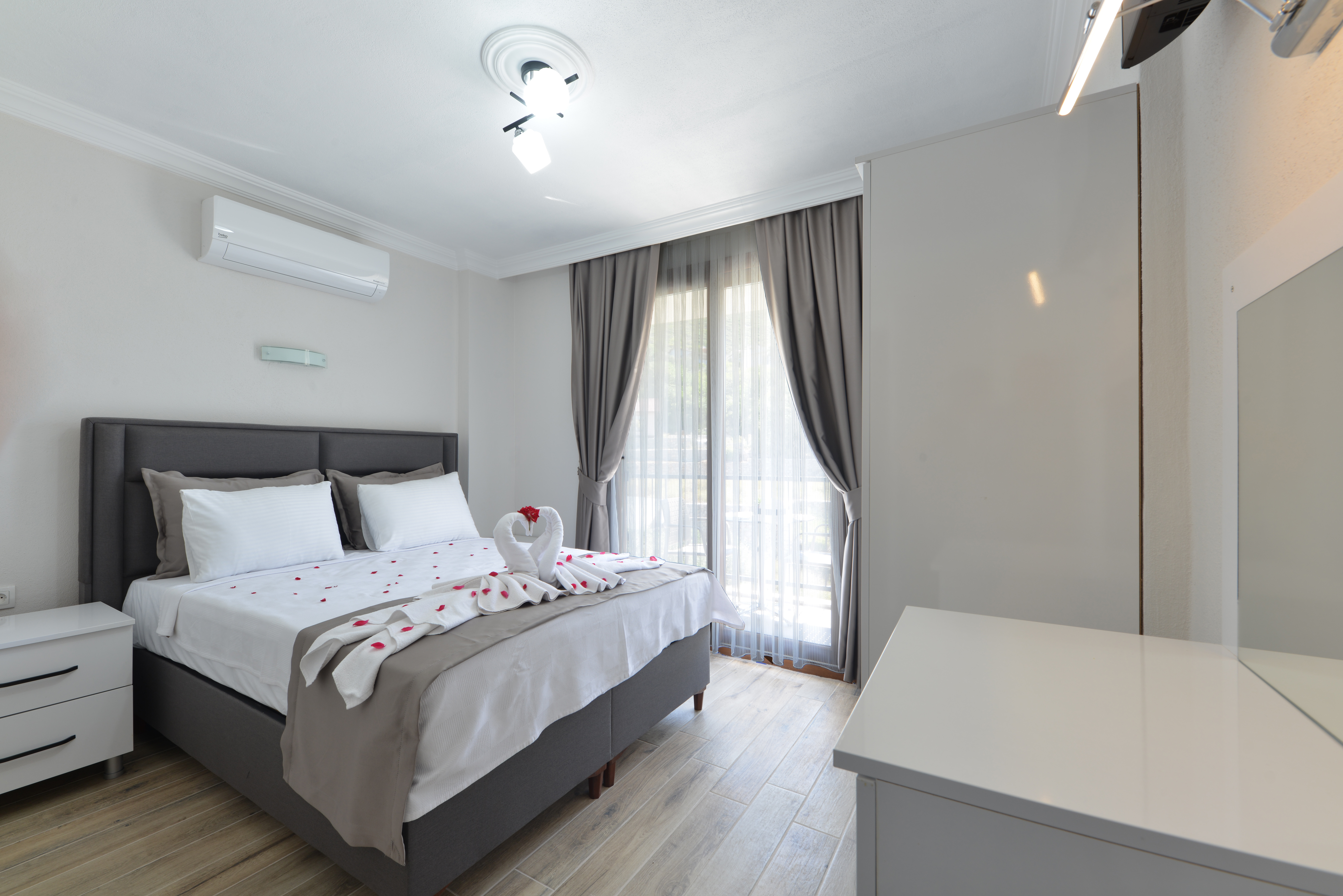 1.Yatak odası 1 çift kişilik yatak + elbise dolabı + komodin + makyaj masası + banyo