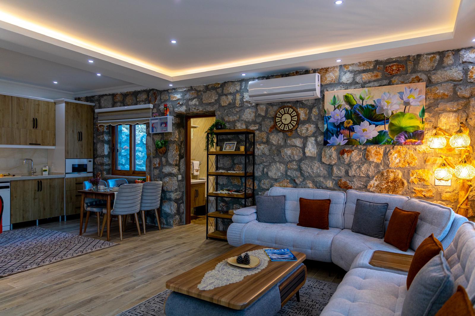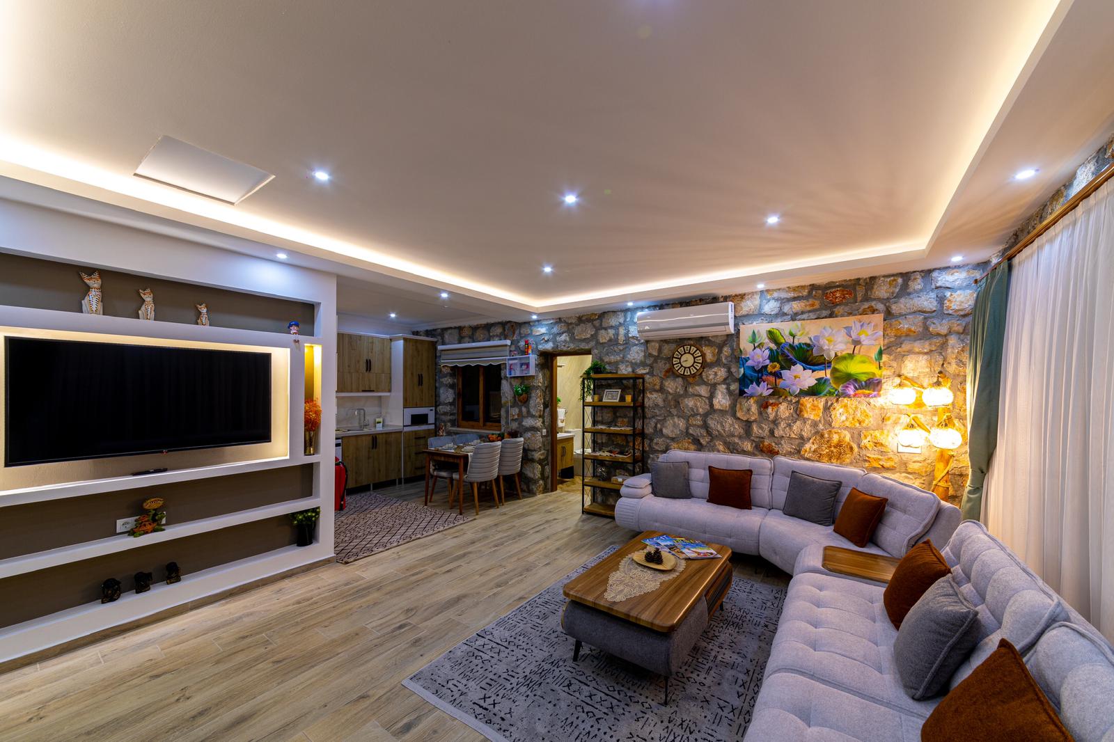 Salon : Oturma grubu, klima, TV, yemek masası, ütü ve ütü masası, Lavabo/WC,
