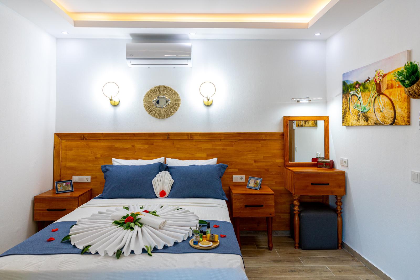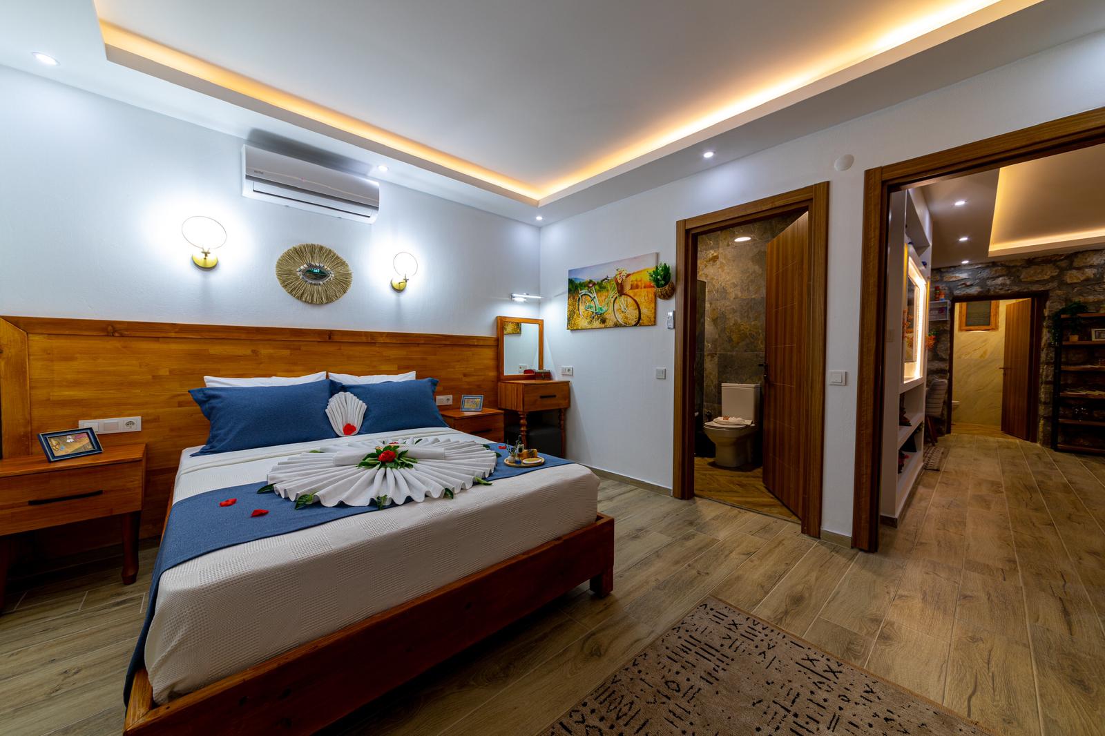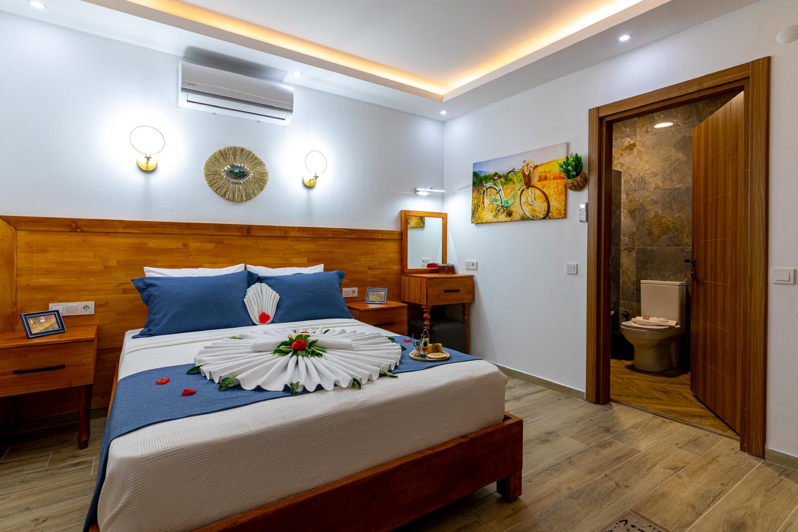 1.Yatak Odası: Çift kişilik yatak, komodin, elbise dolabı, koltuk, makyaj masası, TV, klima, banyo, WC, saç kurutma makinesi ve balkon bulunmaktadır.