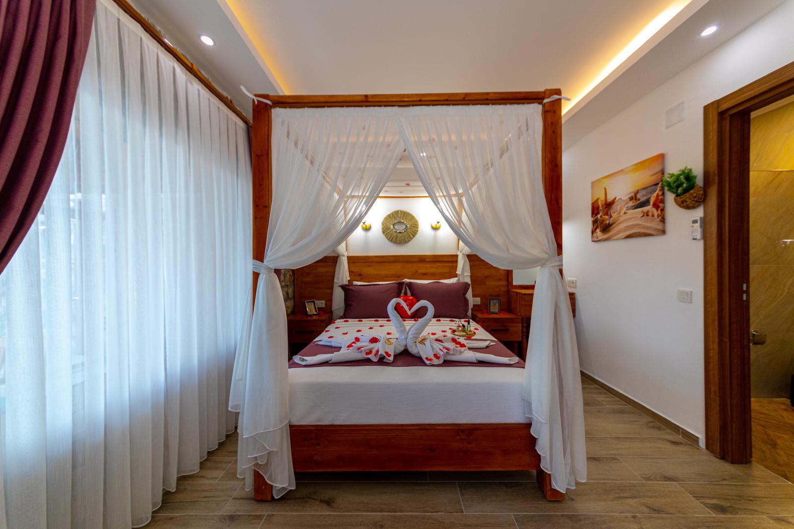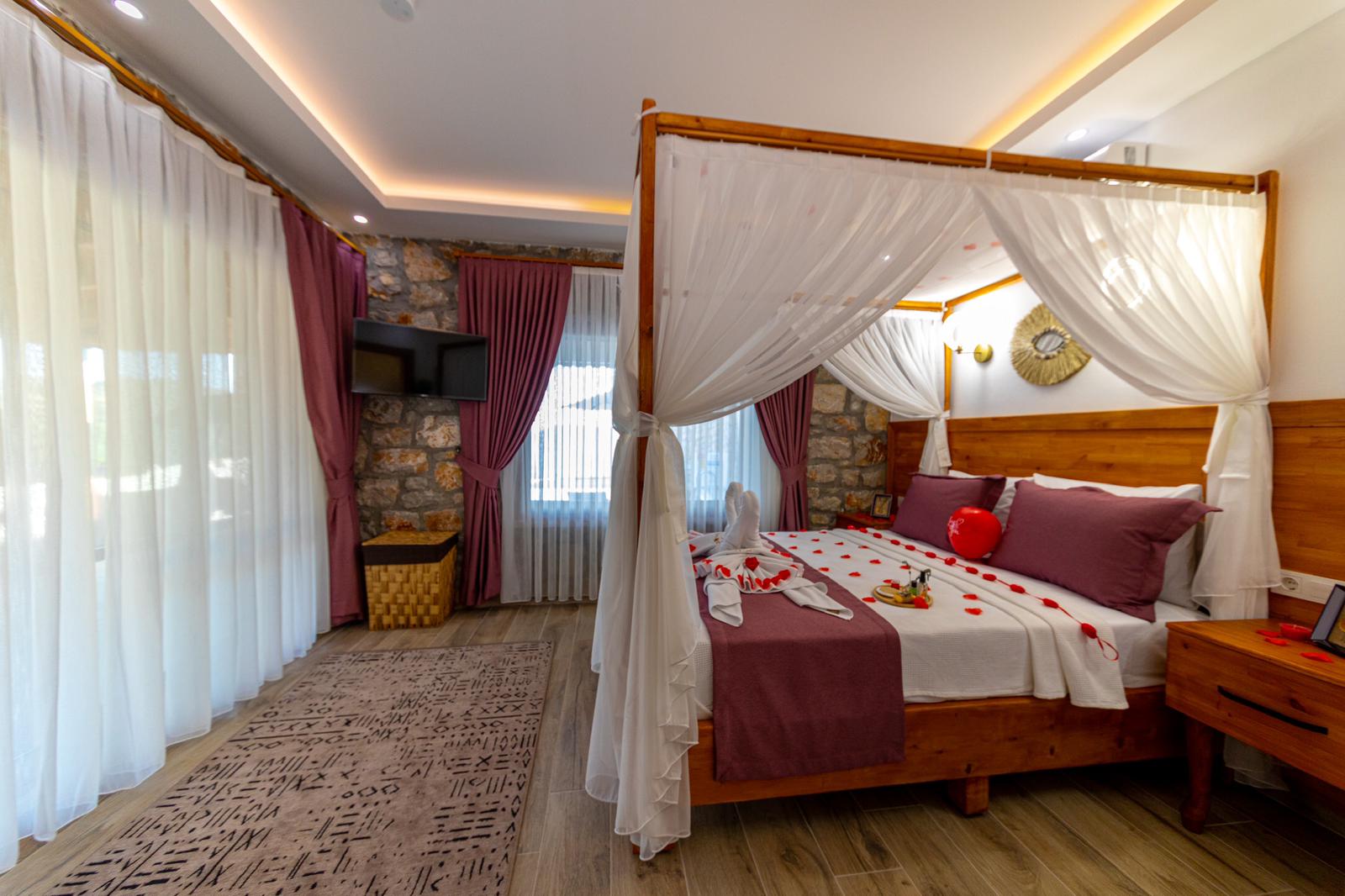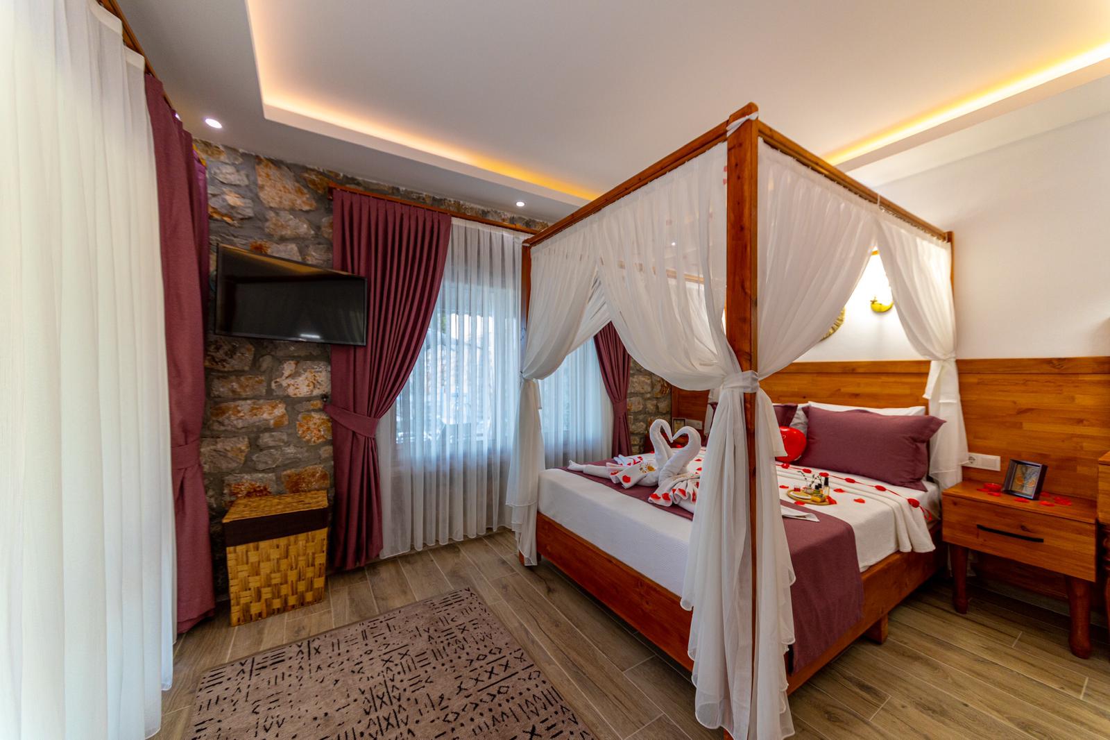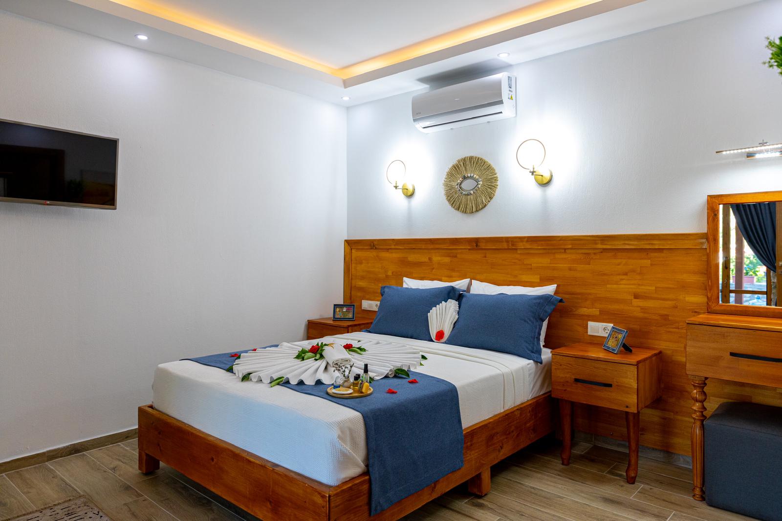 1.Yatak Odası: Çift kişilik yatak, komodin, elbise dolabı, koltuk, makyaj masası, TV, klima, banyo, WC, saç kurutma makinesi ve balkon bulunmaktadır.