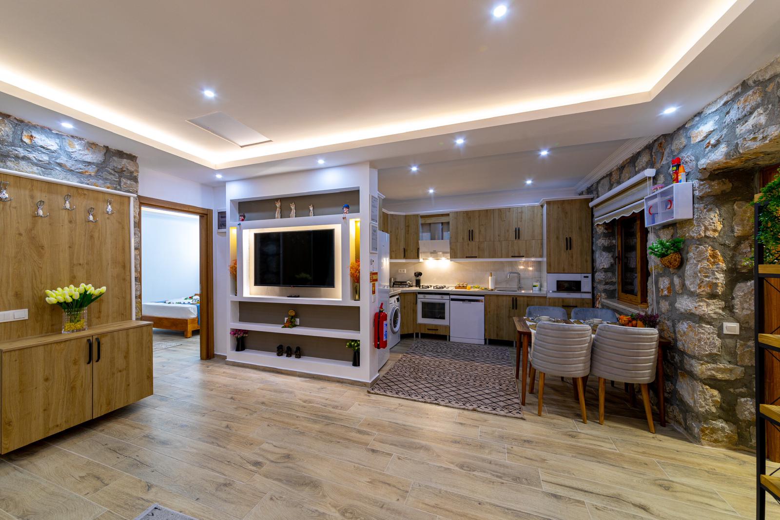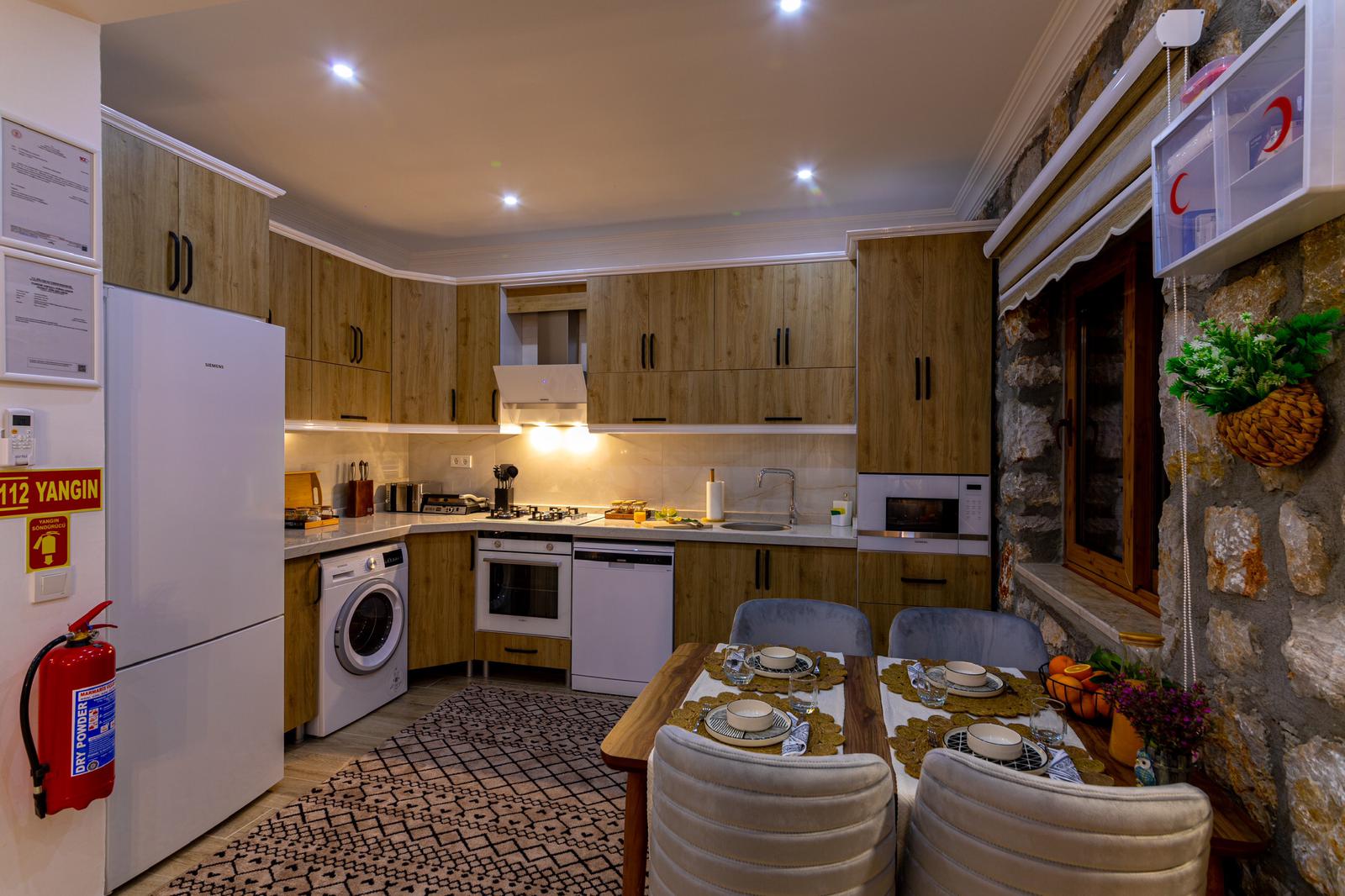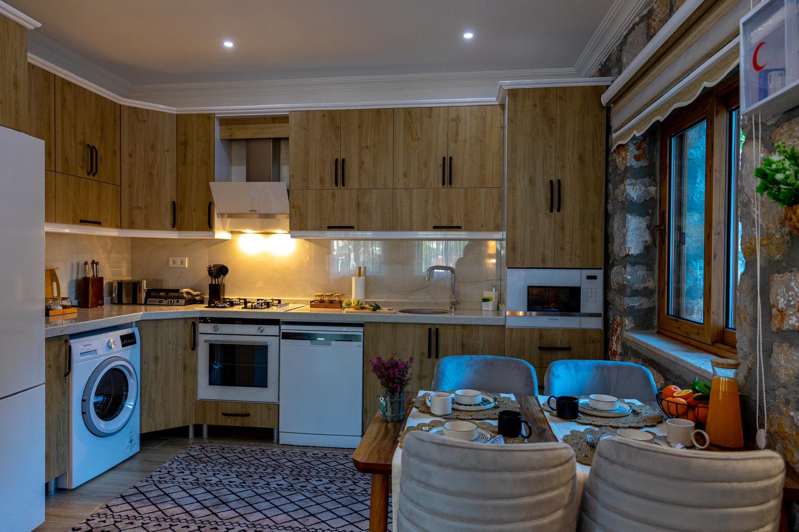 Mutfak : Buzdolabı, bulaşık makinesi, çamaşır makinesi, fırın, ocak, tost makinesi, ekmek kızartma makinesi, mikrodalga fırın, kettle, 4 kişilik yemek masası, tabak, bardak, tava-tencere, çatal-bıçak seti vb gerekli olan tüm mutfak ekipmanları mevcuttur.